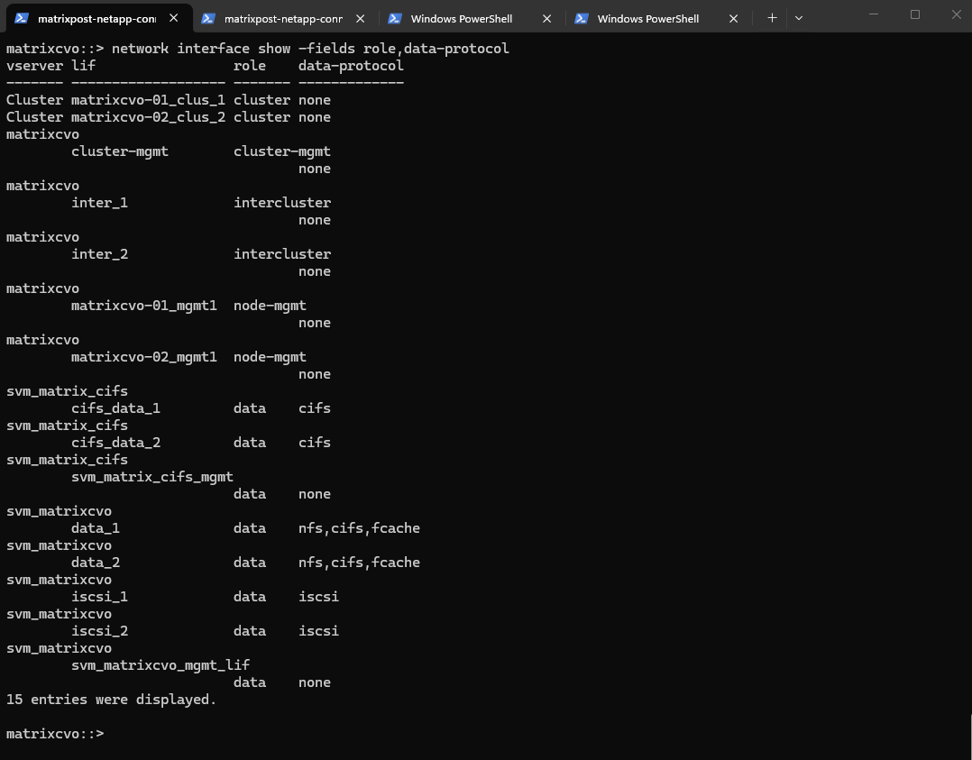 matrixcvo::> network interface show -fields role,data-protocol