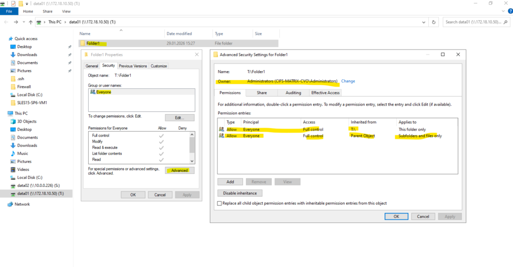 After creating the SMB share, the NTFS permissions still need to be adjusted. This is done by mounting the share from a Windows system and modifying the security settings directly via Windows Explorer, as NTFS permissions are managed at the filesystem level and not through ONTAP CLI. This approach ensures proper ownership, inheritance, and access control for users and groups.