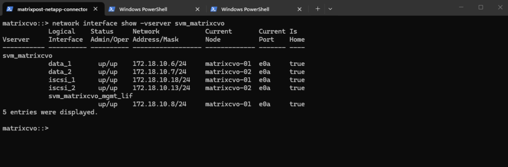 To determine these IP addresses first, I will run the following command which lists all IP addresses (LIFs) in the cluster.