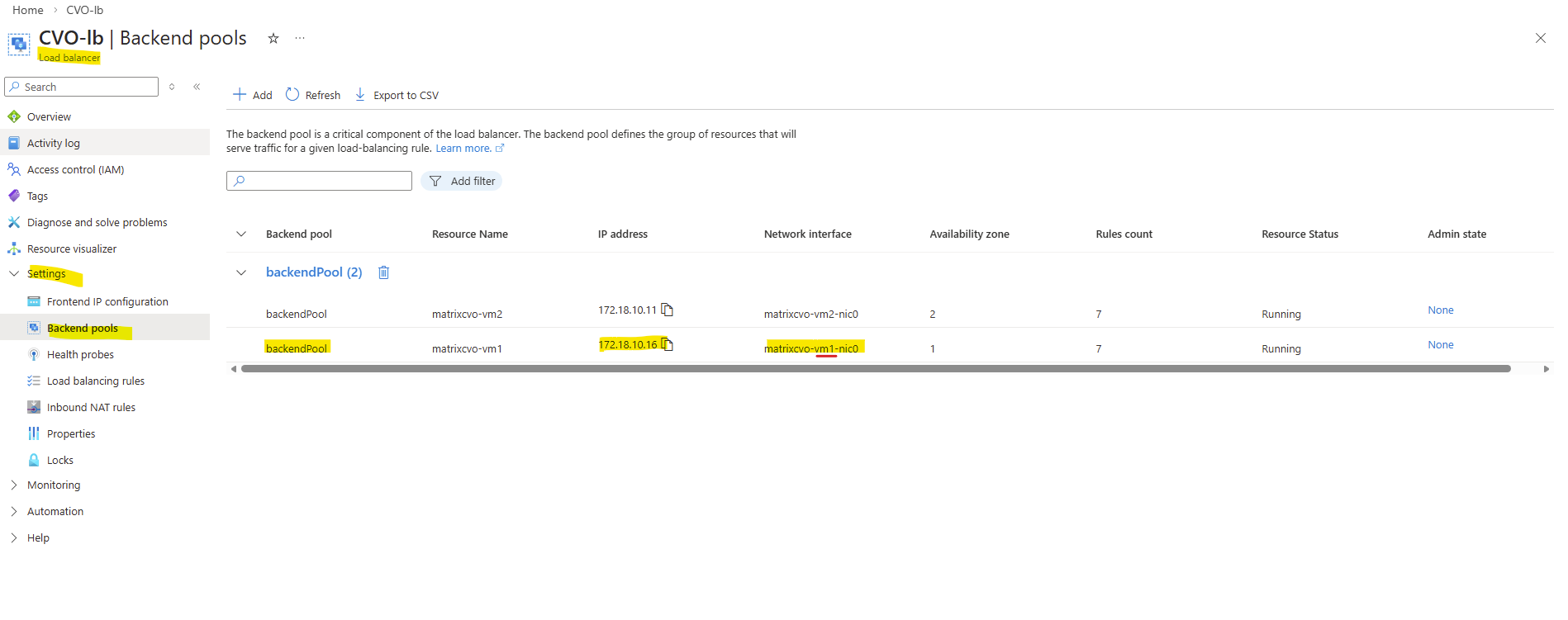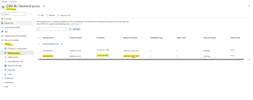 Behind the scenes, the Azure Internal Load Balancer backend pool contains the node management interfaces of both CVO nodes.