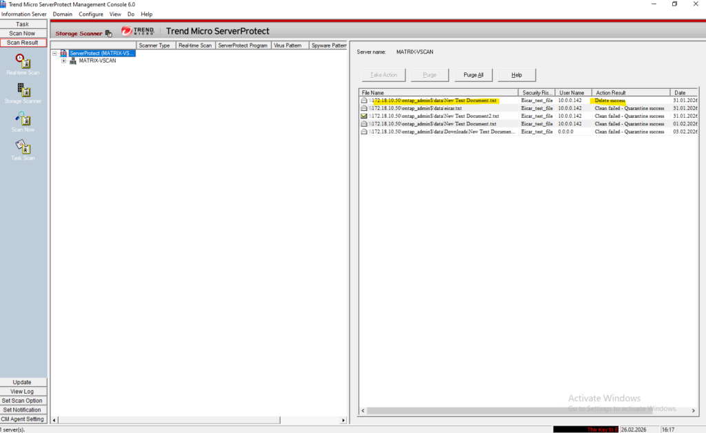 After disabling Defender, ServerProtect successfully detected the test file and the scan results became visible in the console, confirming correct VSCAN operation.