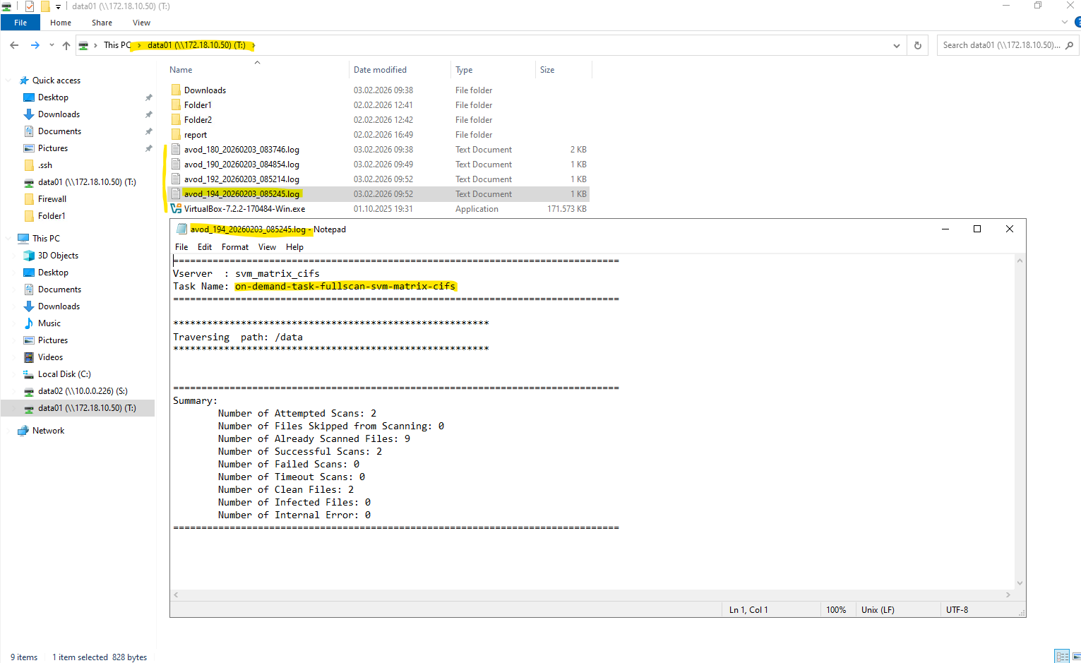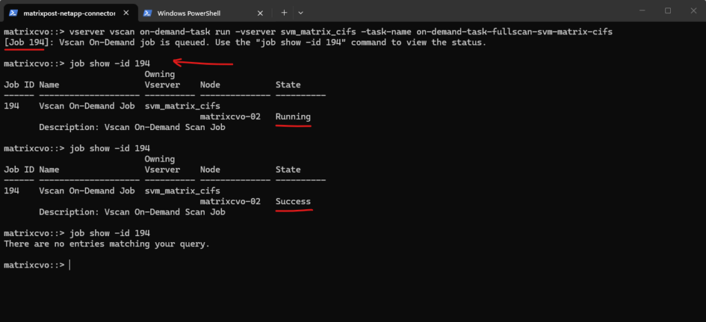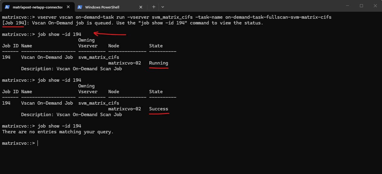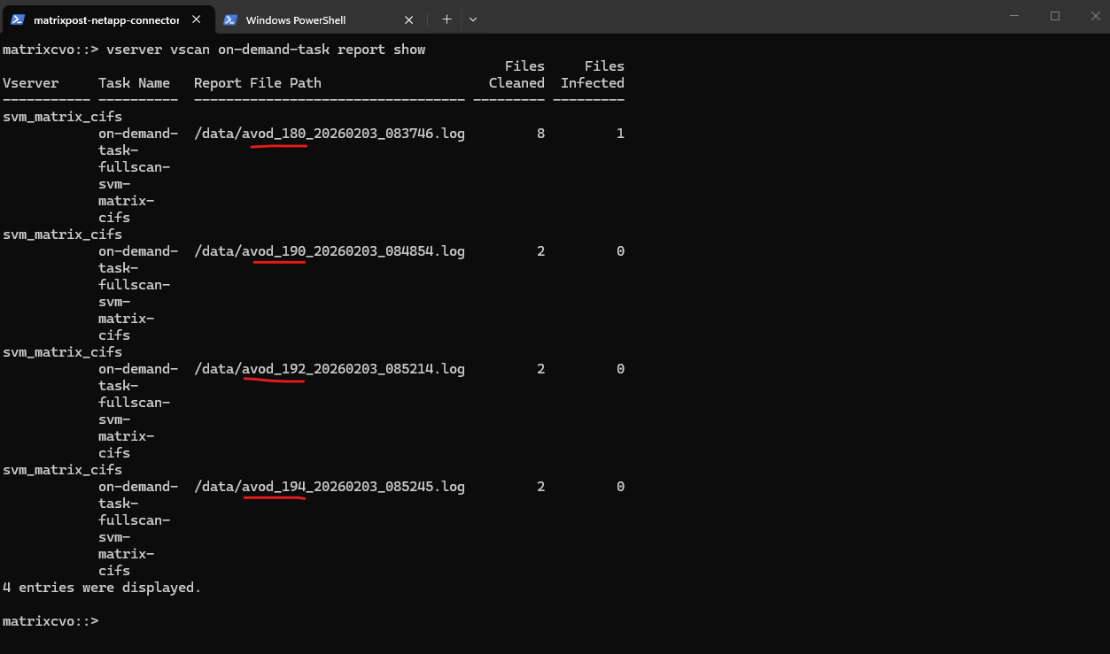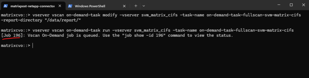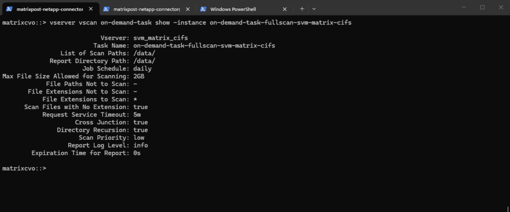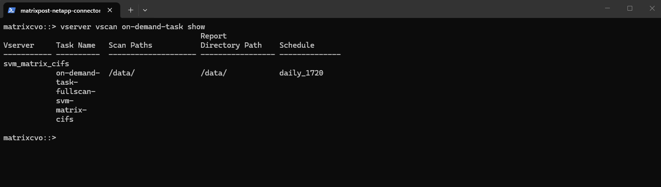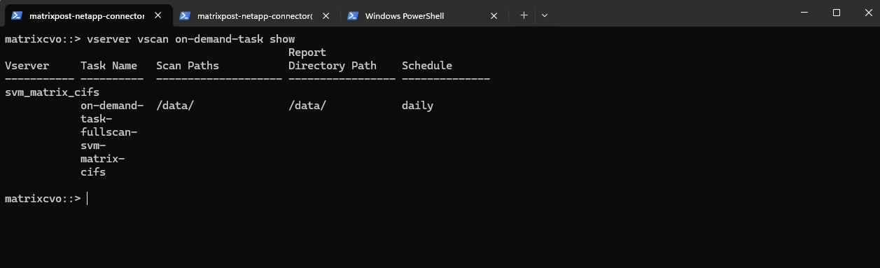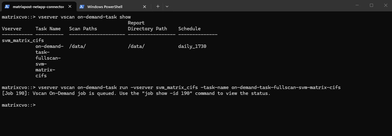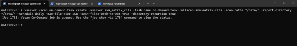matrixcvo::> vserver vscan on-demand-task run -vserver svm_matrix_cifs -task-name on-demand-task-fullscan-svm-matrix-cifs