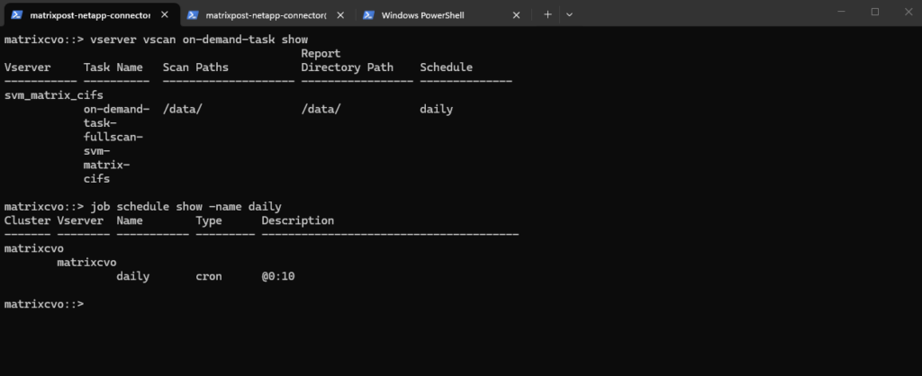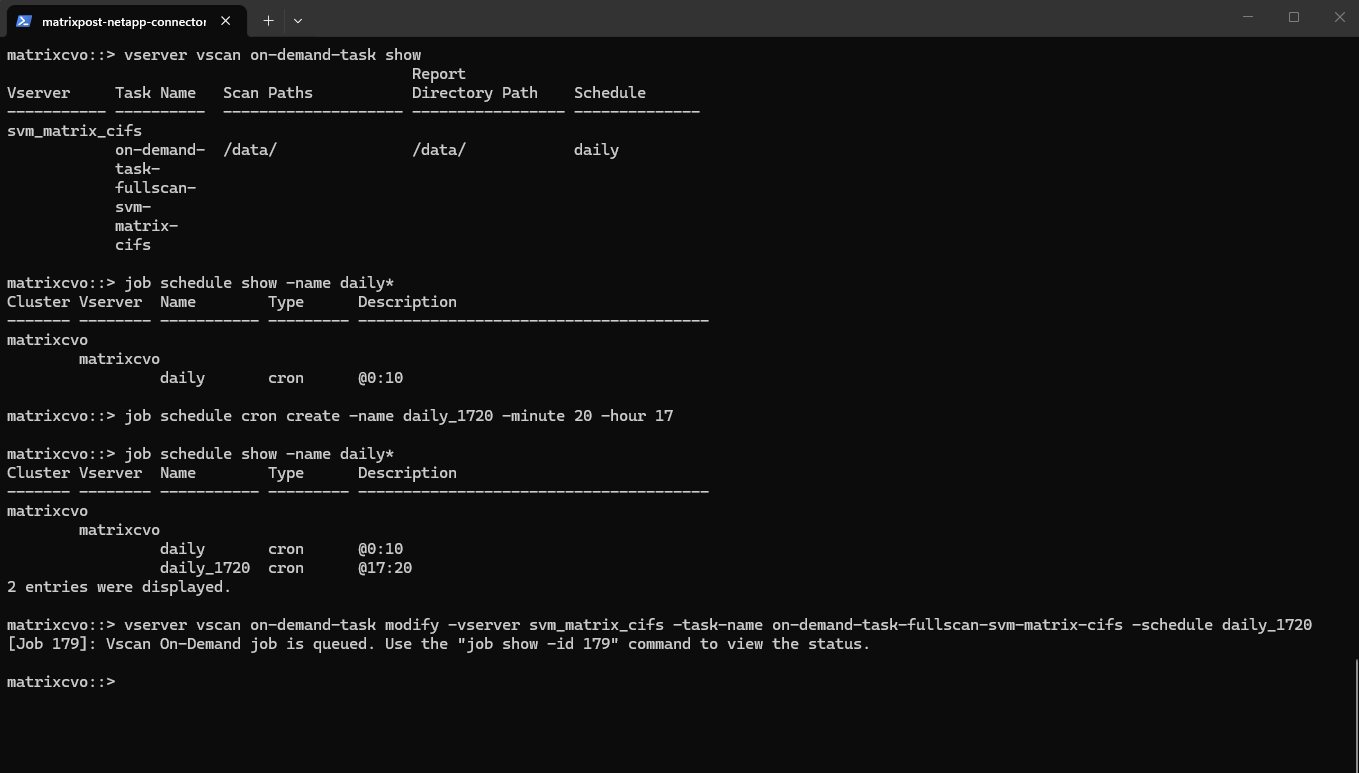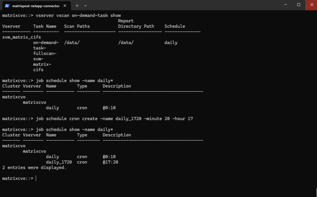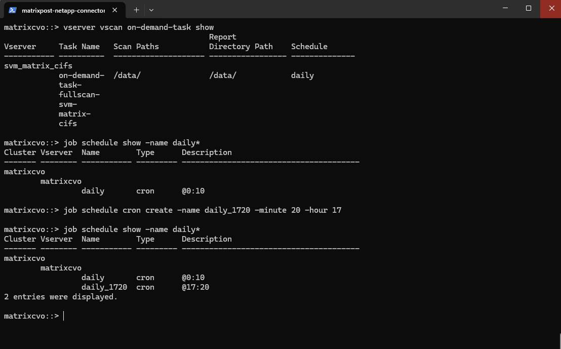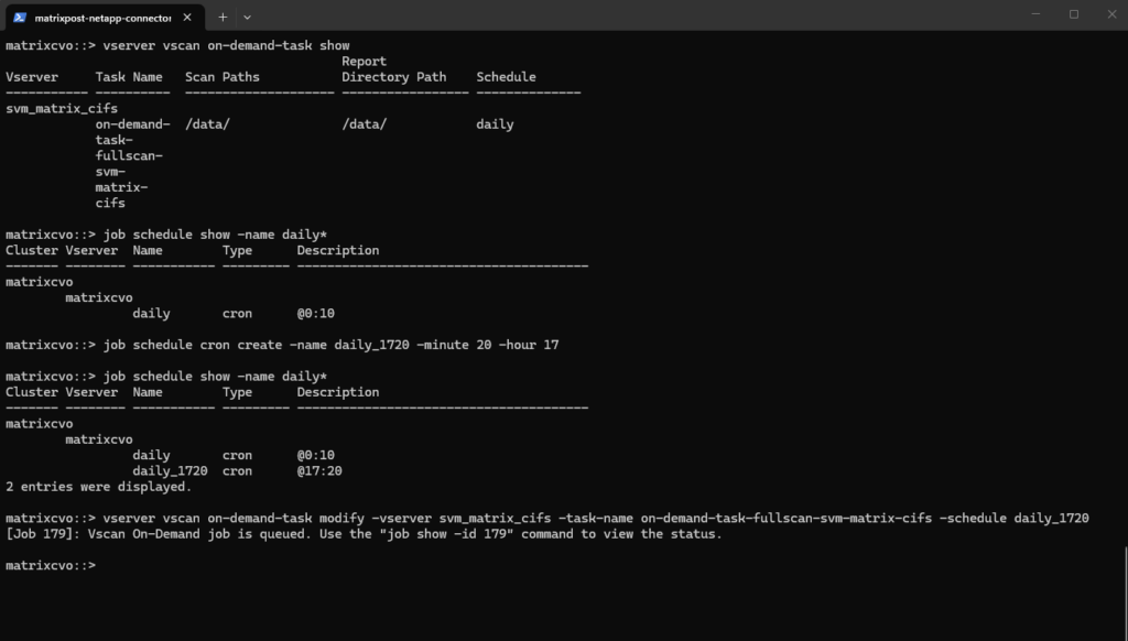 matrixcvo::> vserver vscan on-demand-task modify -vserver svm_matrix_cifs -task-name on-demand-task-fullscan-svm-matrix-cifs -schedule daily_1720