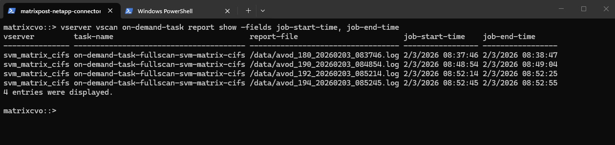 matrixcvo::> vserver vscan on-demand-task report show -fields job-start-time, job-end-time
