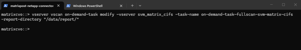 matrixcvo::> vserver vscan on-demand-task modify -vserver svm_matrix_cifs -task-name on-demand-task-fullscan-svm-matrix-cifs -report-directory "/data/report/"