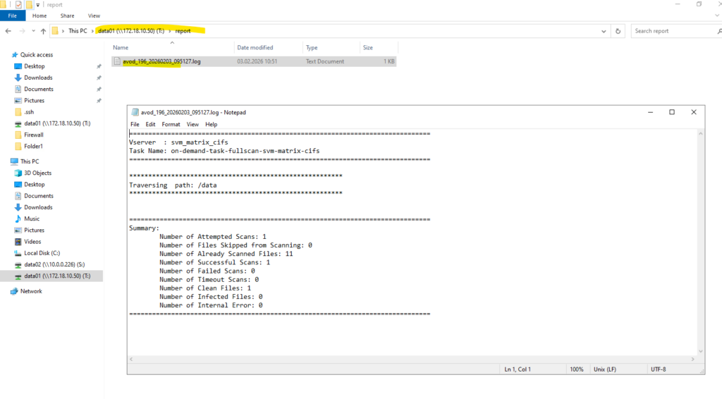 So far my reports will be stored directly on the root path -report-directory "/data/" which is the SVM namespace (junction path) of my volume and set for the creation of the on-demand task previously.