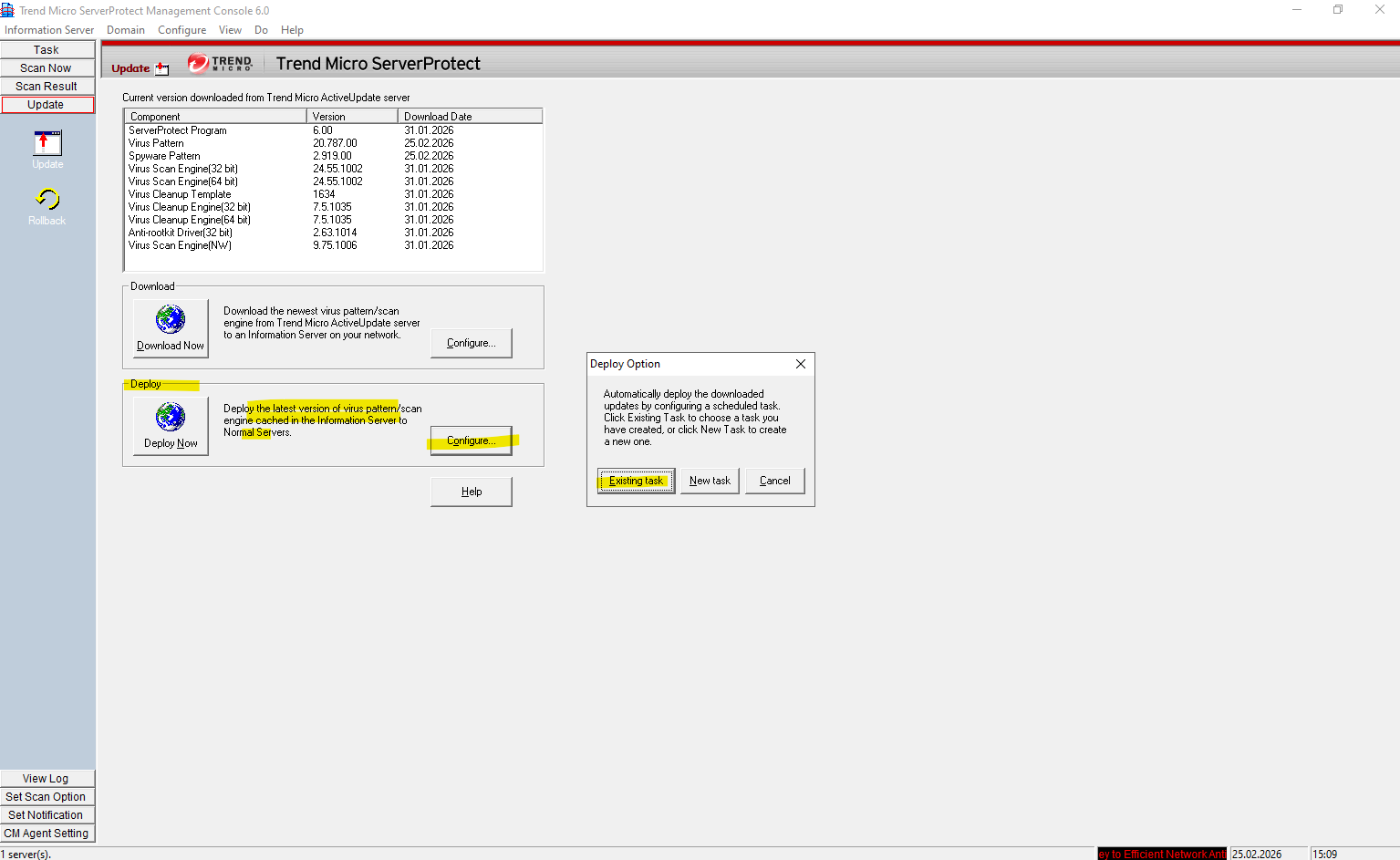 To ensure the DEPLOY task is operating correctly, verify that it is scheduled to trigger immediately after your download finishes and that the Target Server (in your case, the local localhost) is correctly selected. You can confirm success by checking the “Task Logs” to ensure the status shows as Completed without errors, signifying the new patterns are actively loaded into the scanning engine.