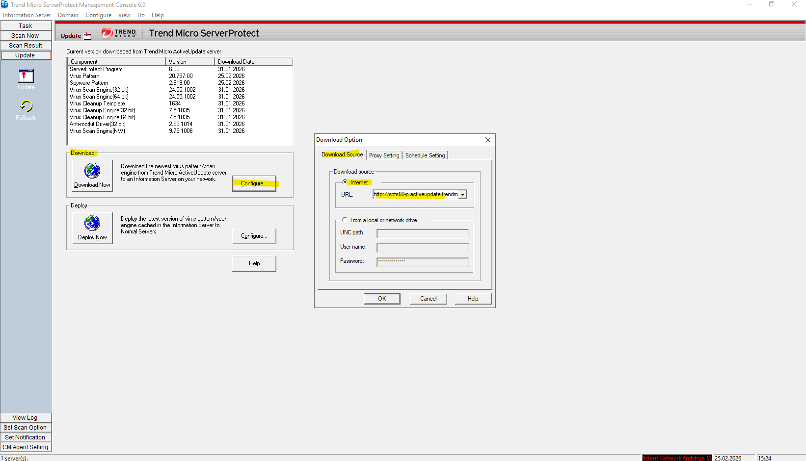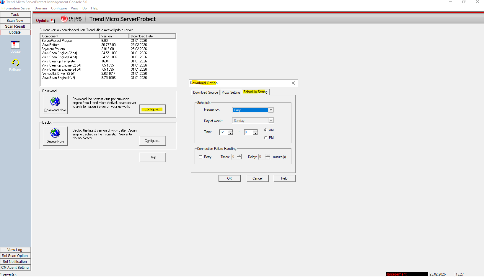 To ensure your updates are flowing correctly, verify that the Download settings are configured to pull from the Trend Micro ActiveUpdate server (or your specific source) and that the scheduled frequency aligns with your security policy.