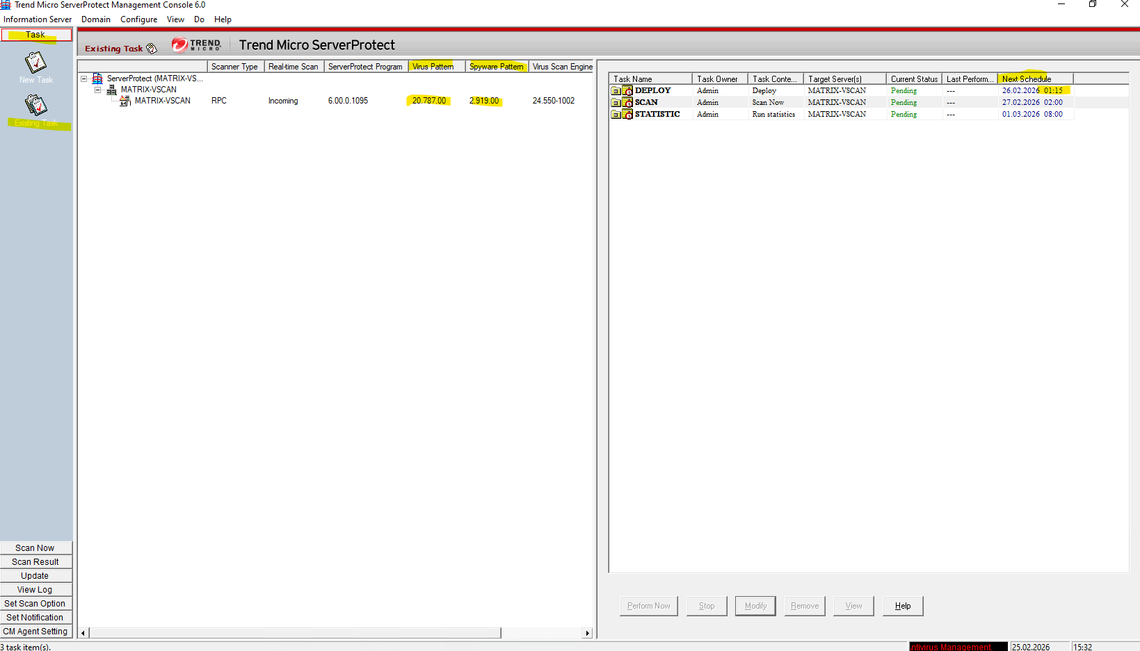To ensure a smooth transition from acquisition to activation, I have scheduled the DEPLOY task to trigger automatically 15 minutes after the download schedule finishes, allowing ample time for the new patterns to be fully staged before they are loaded into the scanning engine.