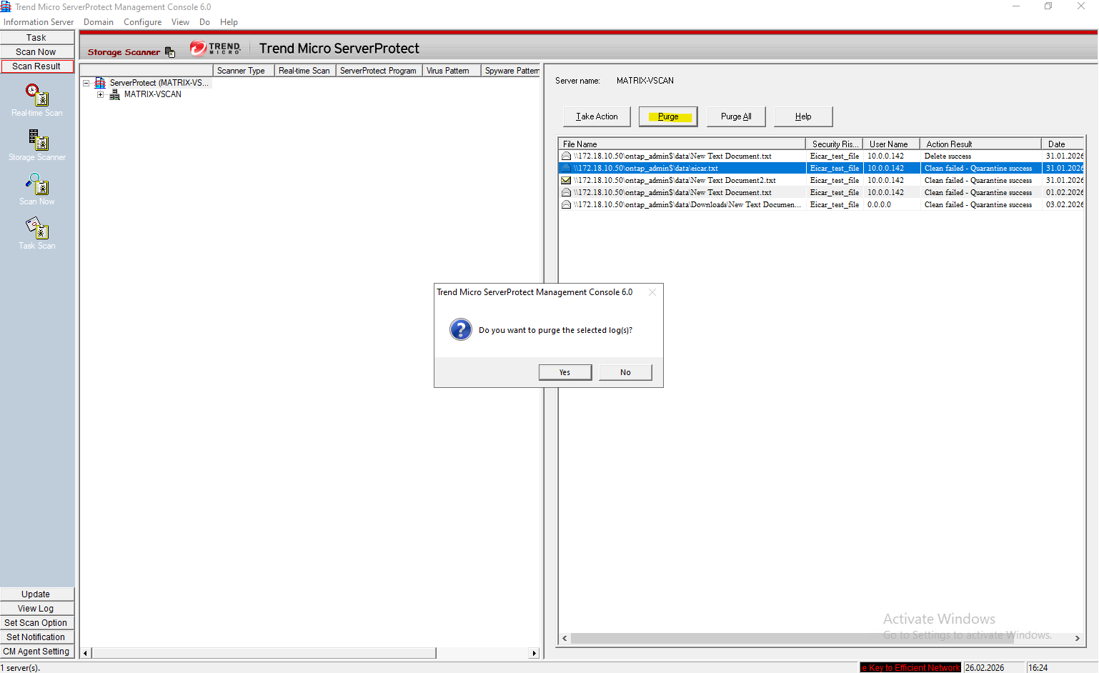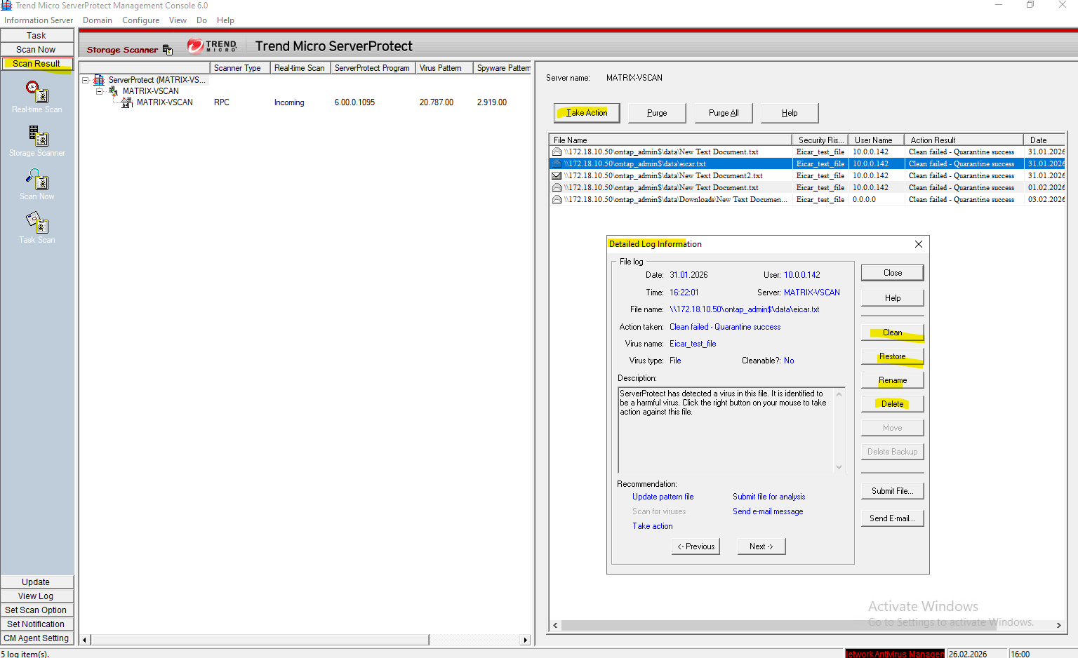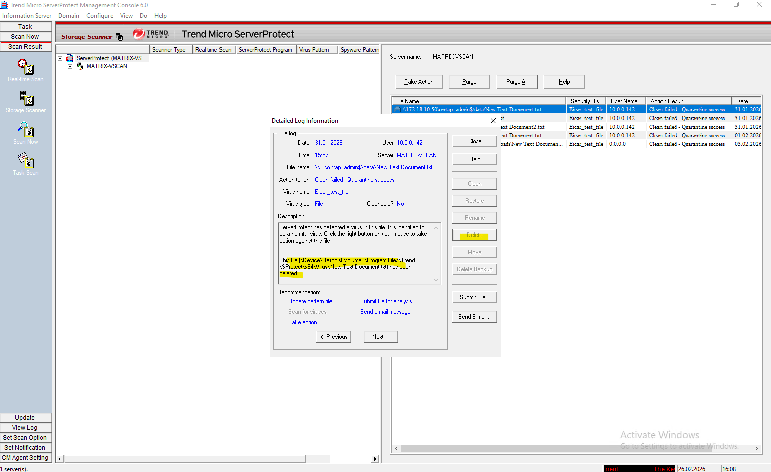 After disabling Defender, ServerProtect successfully detected the test file and the scan results became visible in the console, confirming correct VSCAN operation.