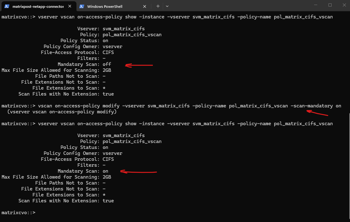 matrixcvo::> vscan scanner-pool create -vserver svm_matrix_cifs -scanner-pool vscan_matrix_cifs_pool -hostnames 10.0.0.80 -privileged-users MATRIXPOST\superuser