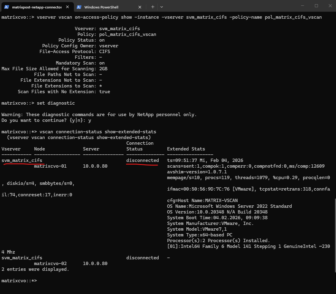 matrixcvo::> set diagnostic matrixcvo::*> vscan connection-status show-extended-stats