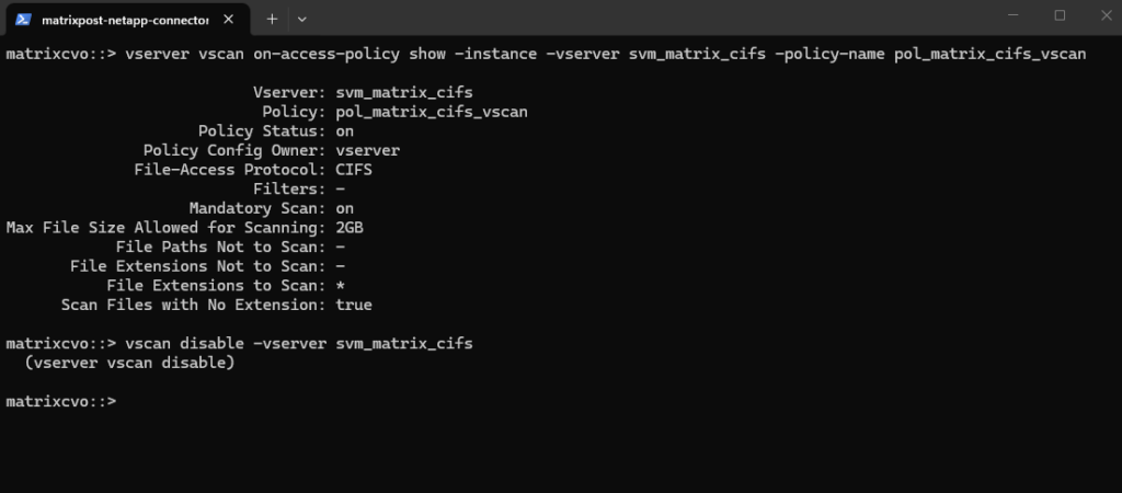 We will now configure and enable VSCAN directly on ONTAP, which is required before any antivirus scanning can take place.