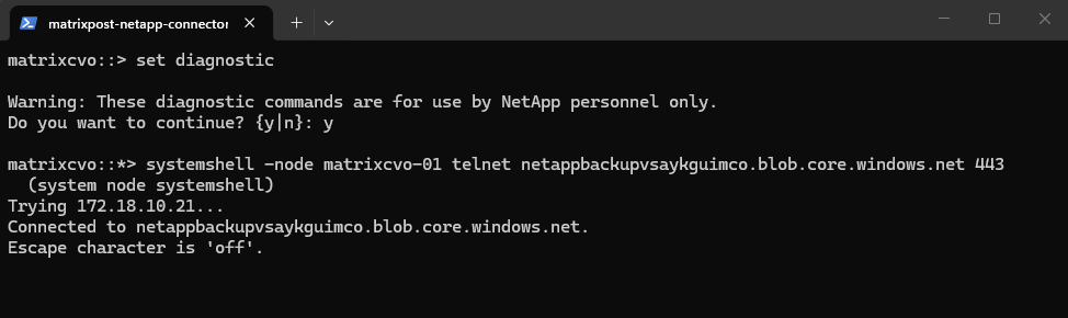 matrixcvo::> set diagnostic matrixcvo::*> systemshell -node matrixcvo-01 telnet netappbackupvsaykguimco.blob.core.windows.net 443