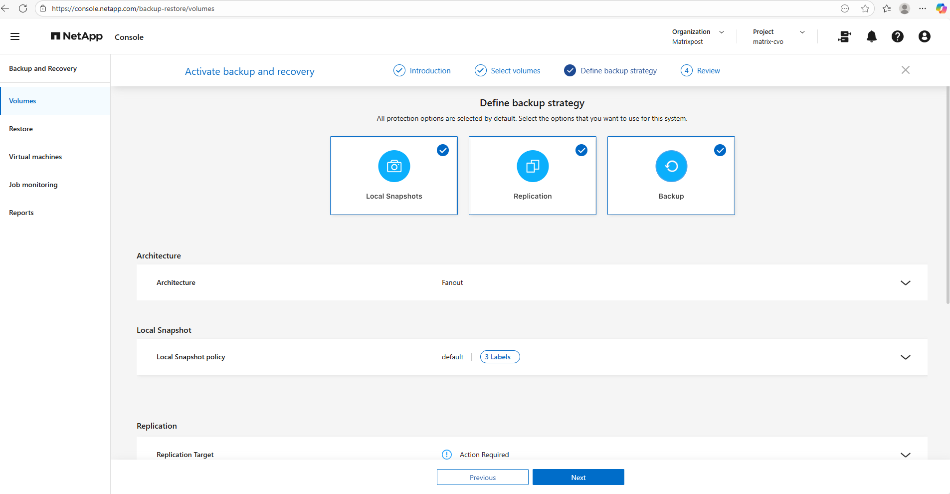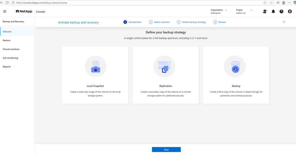 We configure local Snapshot copies for fast, space-efficient restores and define backup policies to object storage for long-term retention and protection against data loss.
