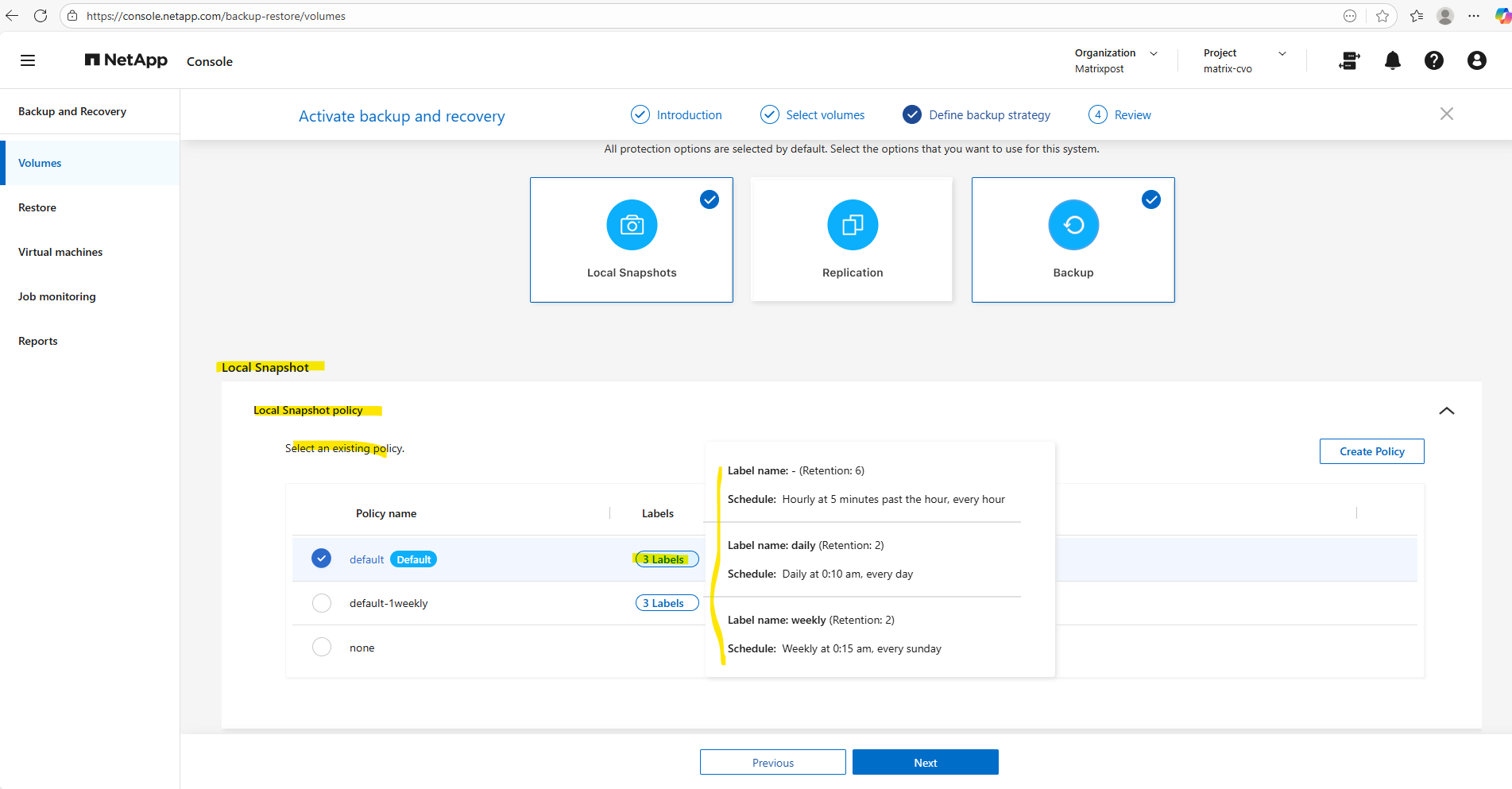 Before activating the backup, we can hover the mouse over the local snapshots and backup policy labels to finally check these settings as shown below.