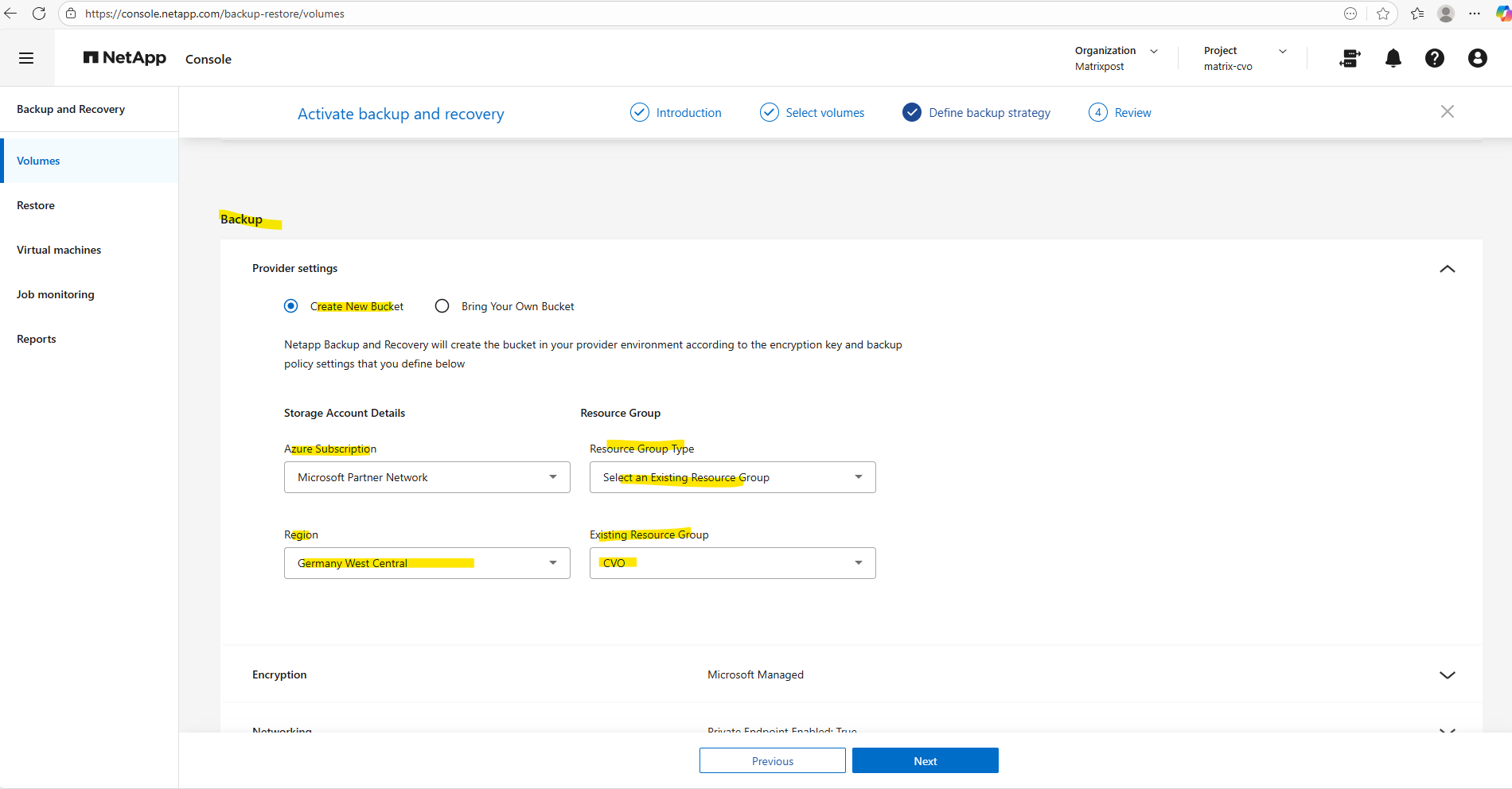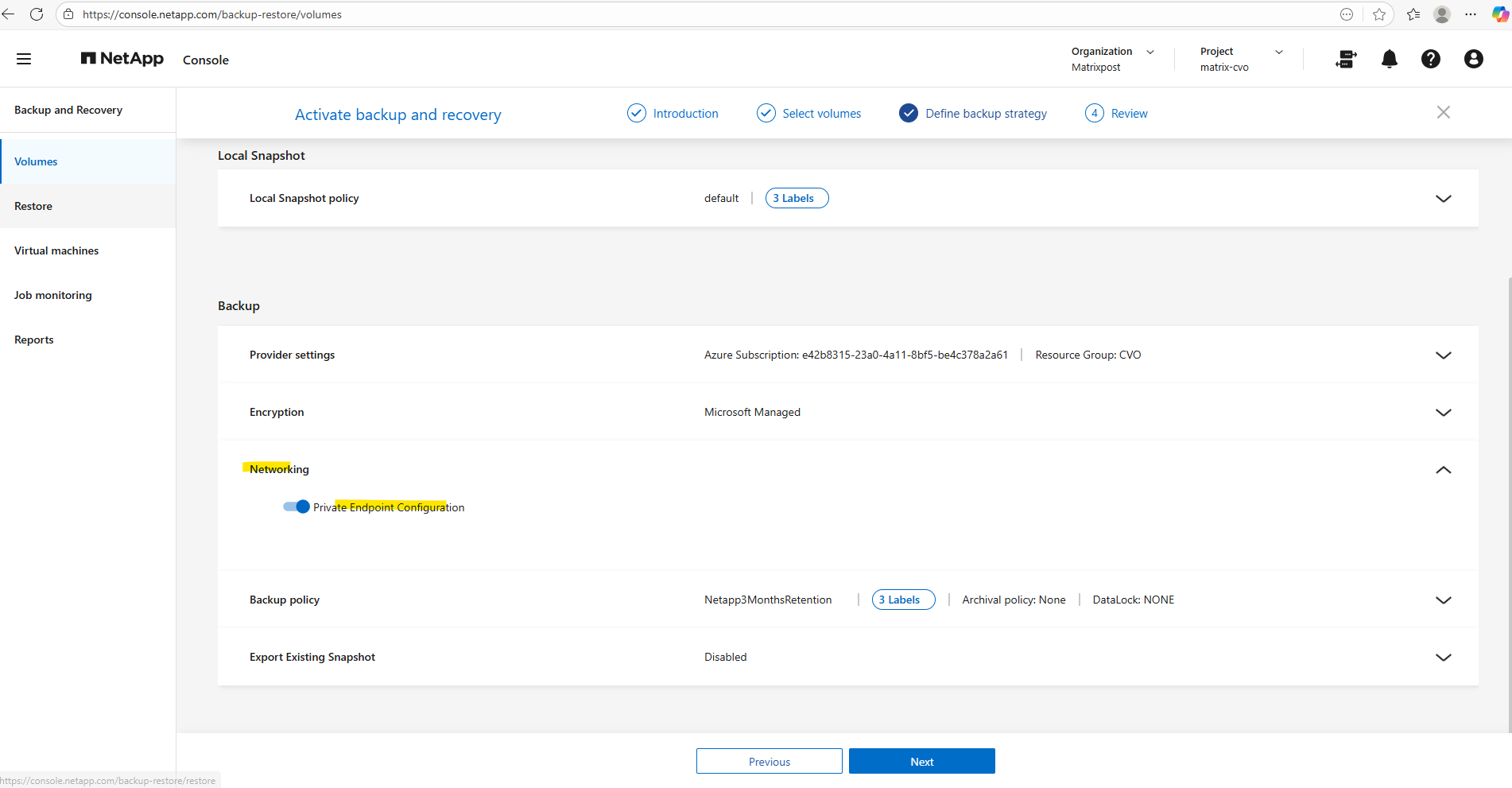 We also provide the necessary details for the NetApp Console to automatically deploy the Azure Storage account, configure network access such as a private endpoint, and finalize the setup by activating the backup.