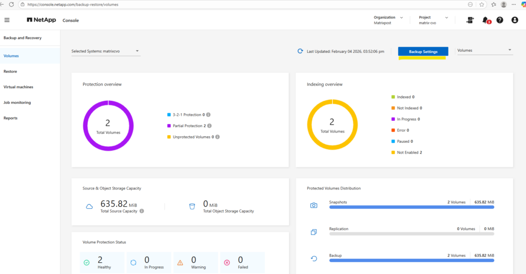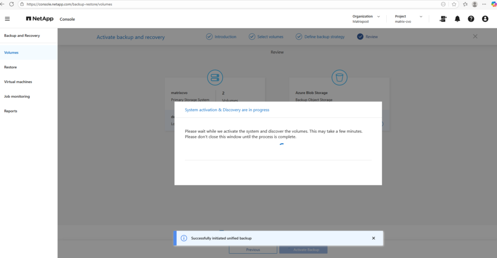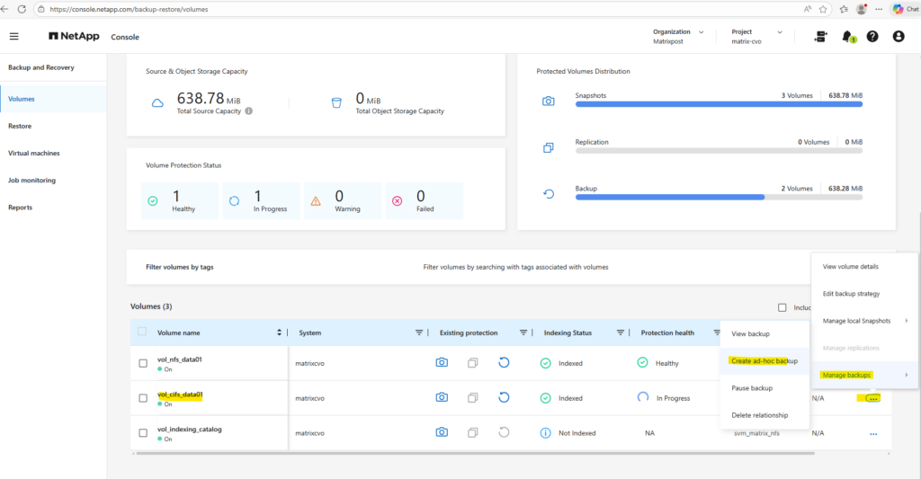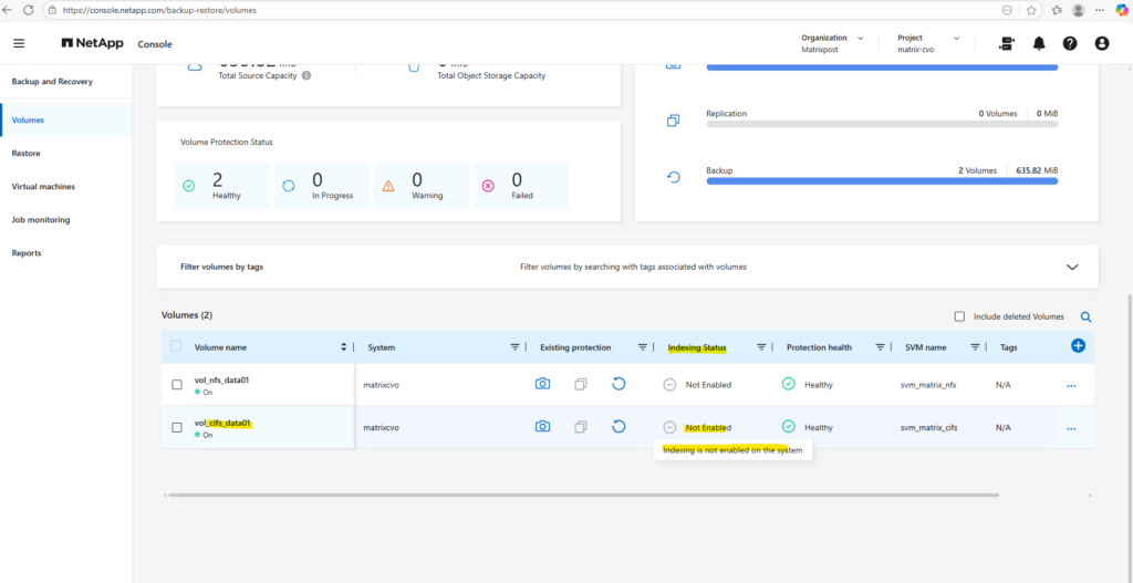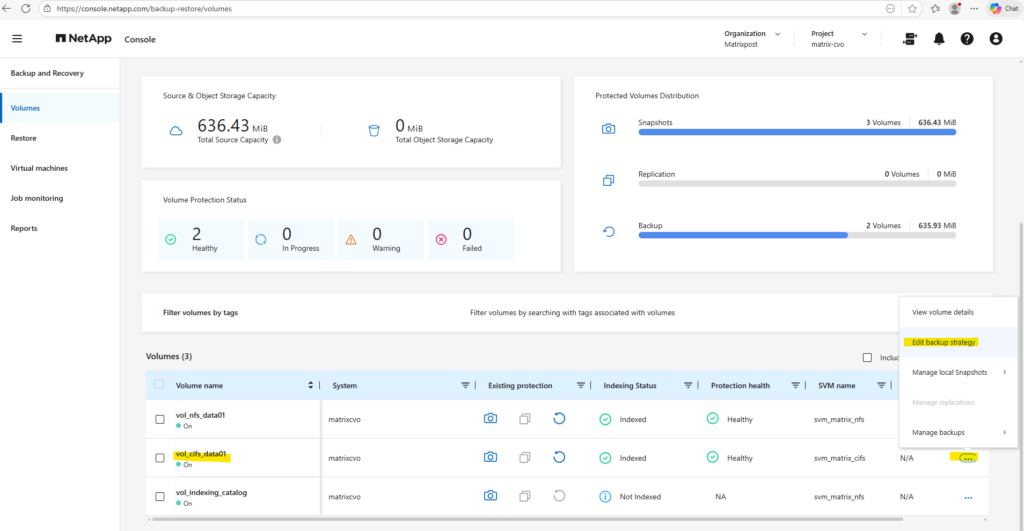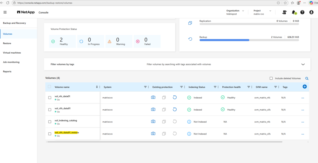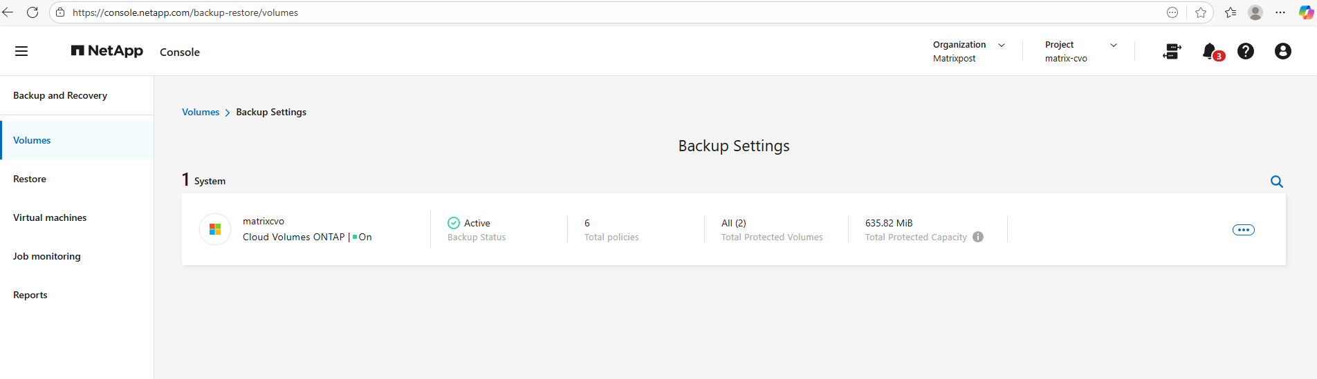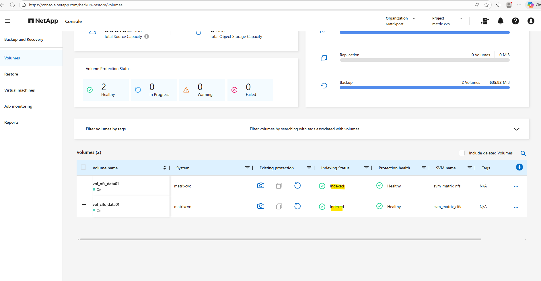 Looks good, after a few minutes we will get redirected to the Backup and Recovery -> Volumes page as shown below.