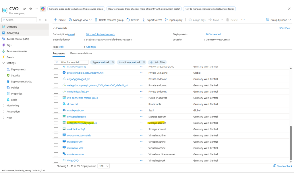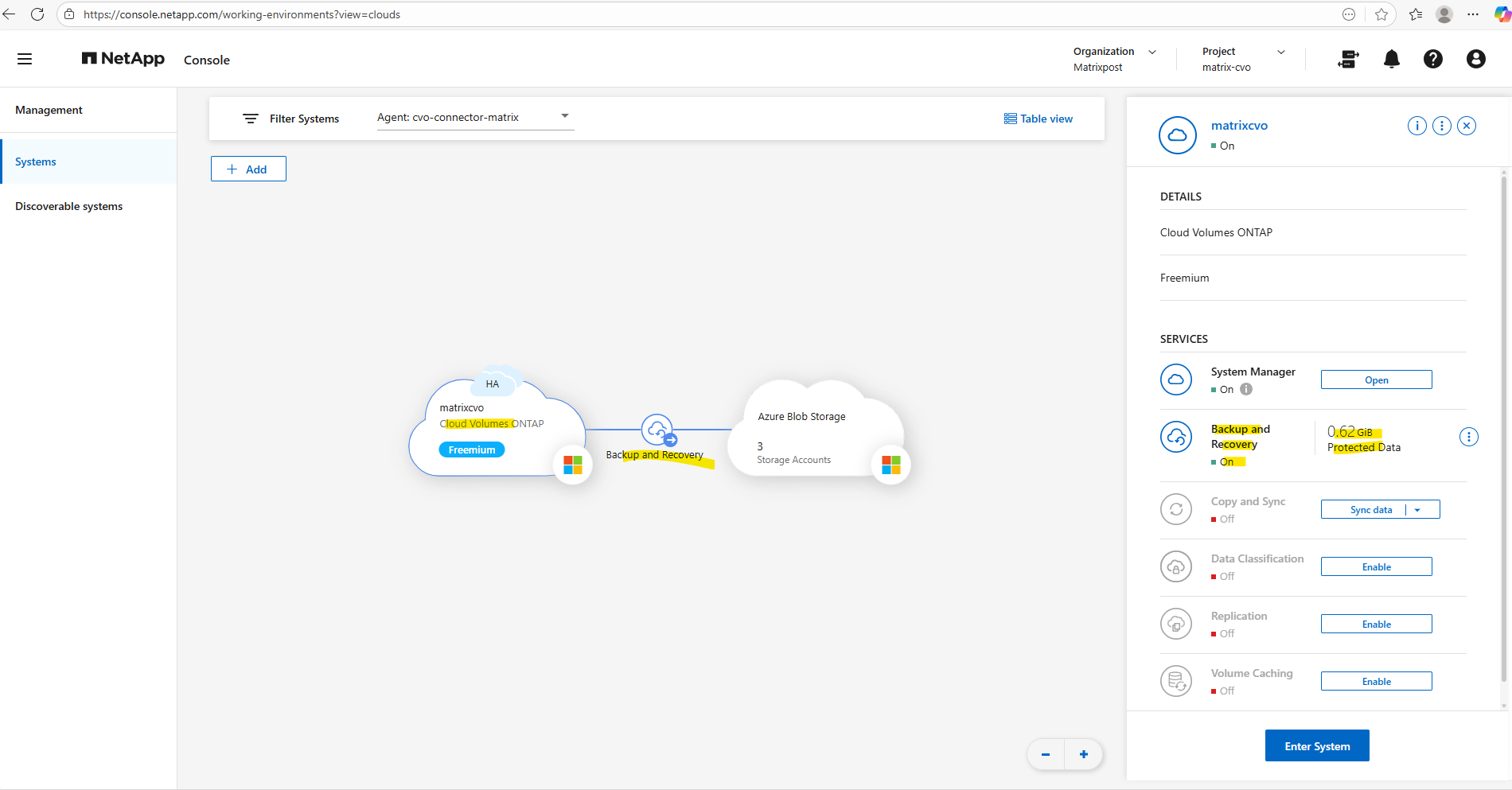 When moving the mouse over the Cloud Volume ONTAP cloud below, we will now also see here that we enabled Backup and Recovery which will be stored to our newly created storage acount (before in my case just 2 accounts were shown here).