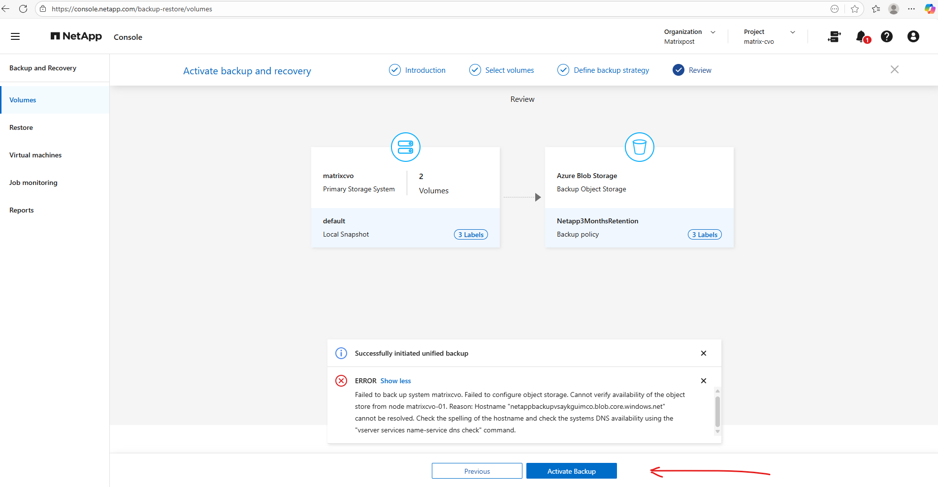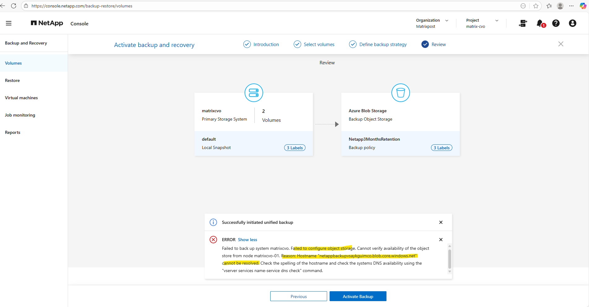 Reason: Hostname “netappbackupvsaykguimco.blob.core.windows.net” cannot be resolved. Check the spelling of the hostname and check the systems DNS availability using the