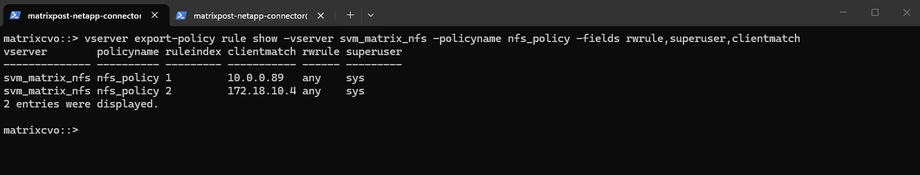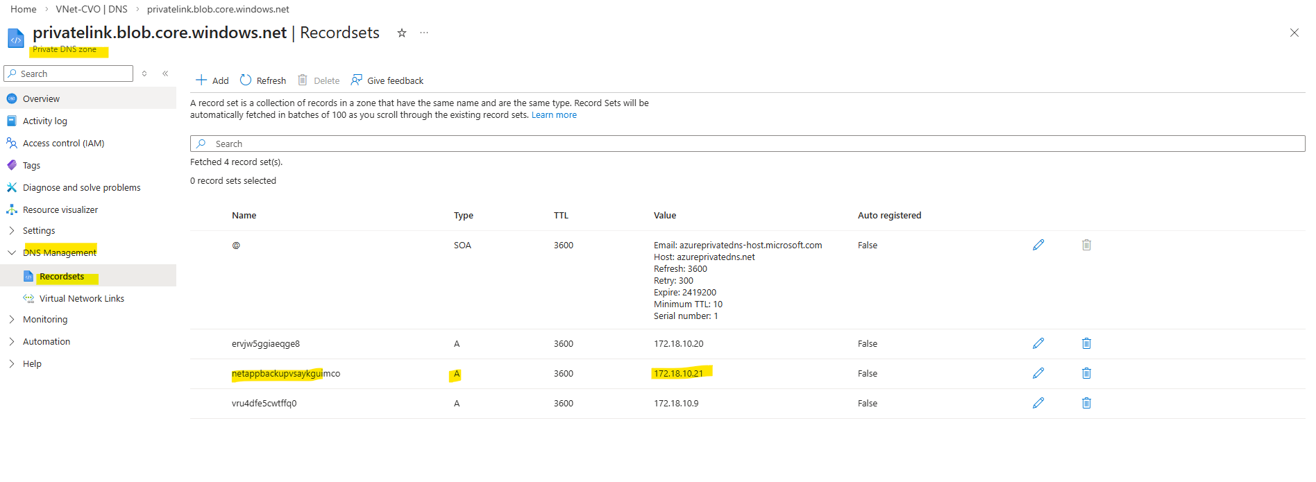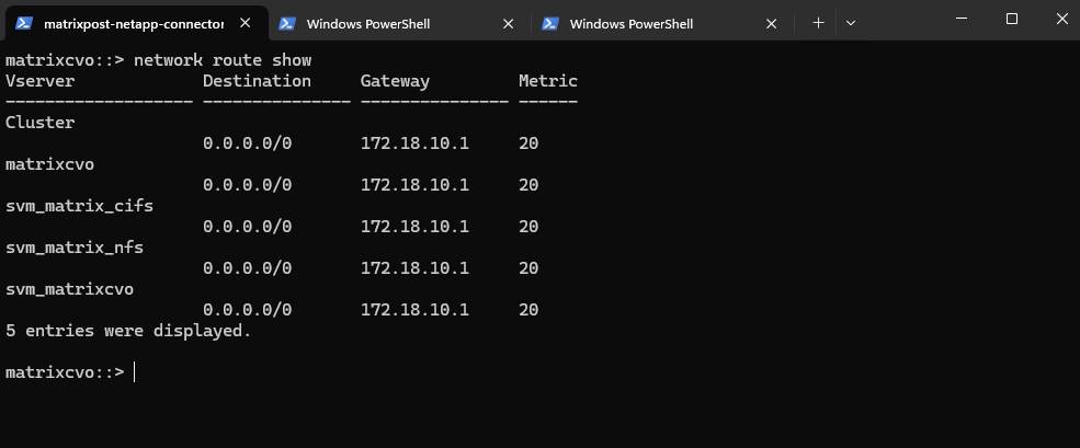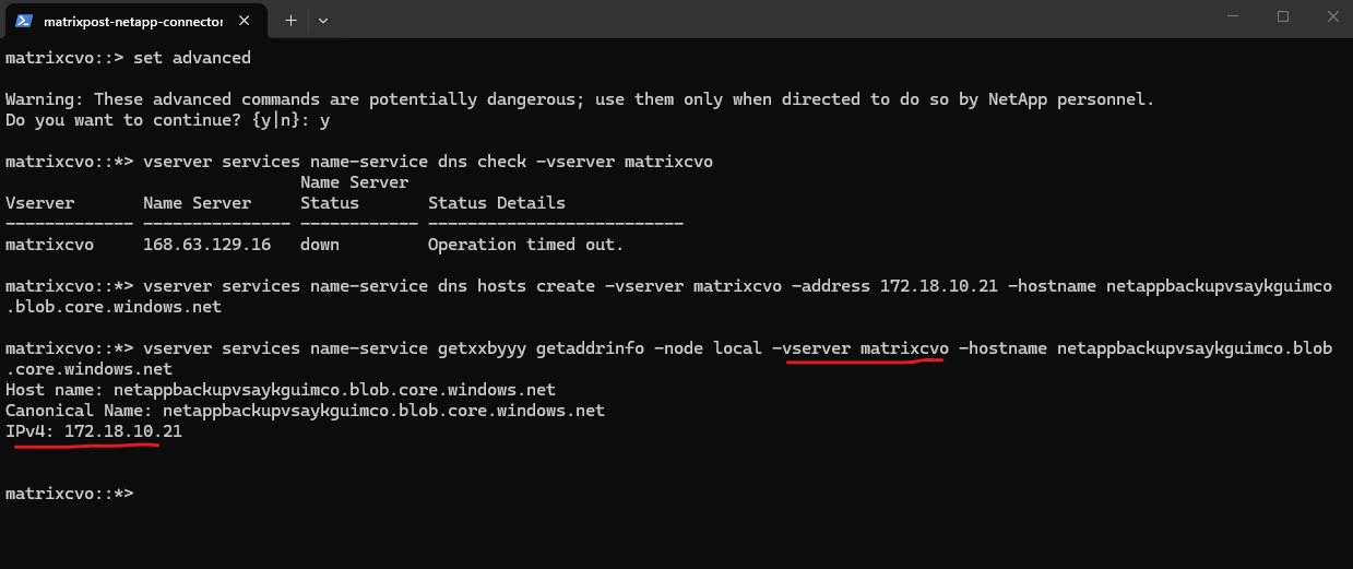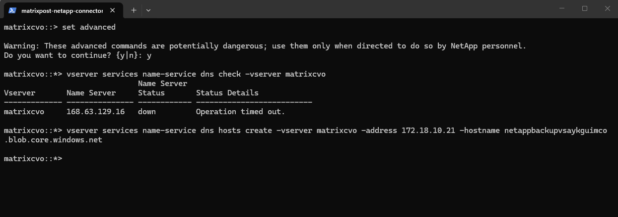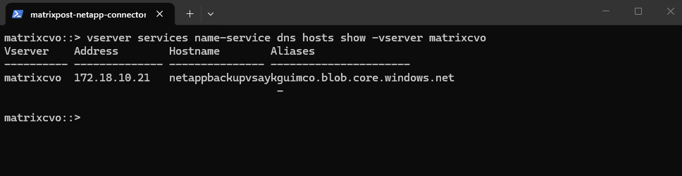 matrixcvo::*> vserver services name-service dns hosts create -vserver matrixcvo -address 172.18.10.21 -hostname netappbackupvsaykguimco.blob.core.windows.net