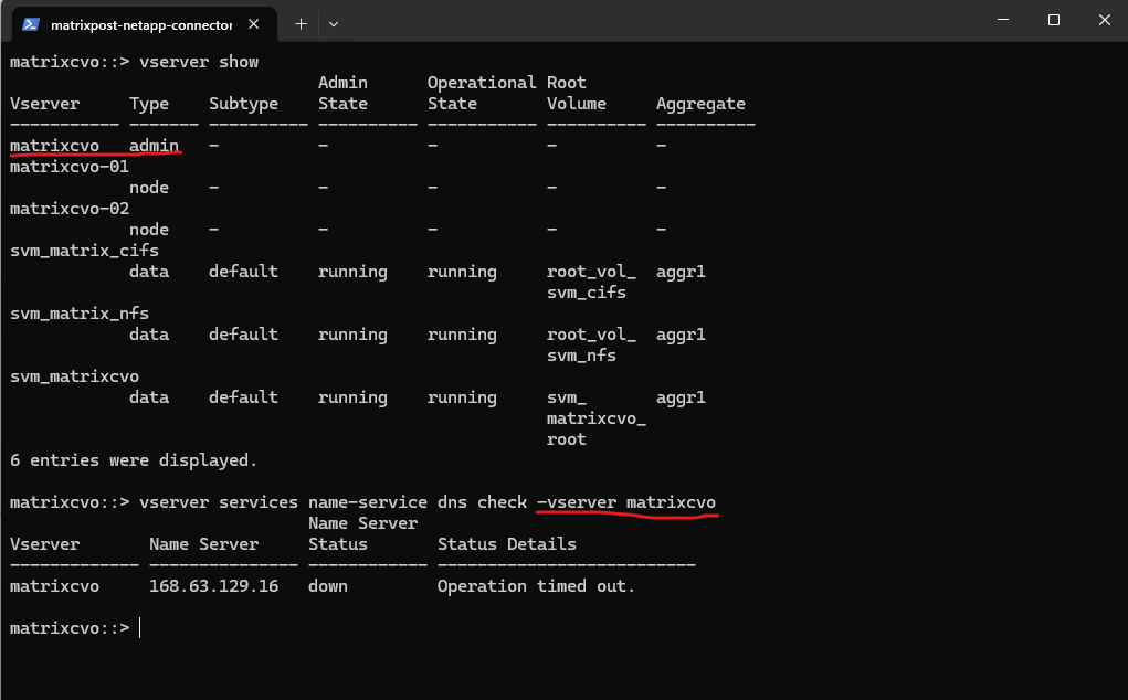 matrixcvo::> vserver show matrixcvo::> vserver services name-service dns check -vserver matrixcvo