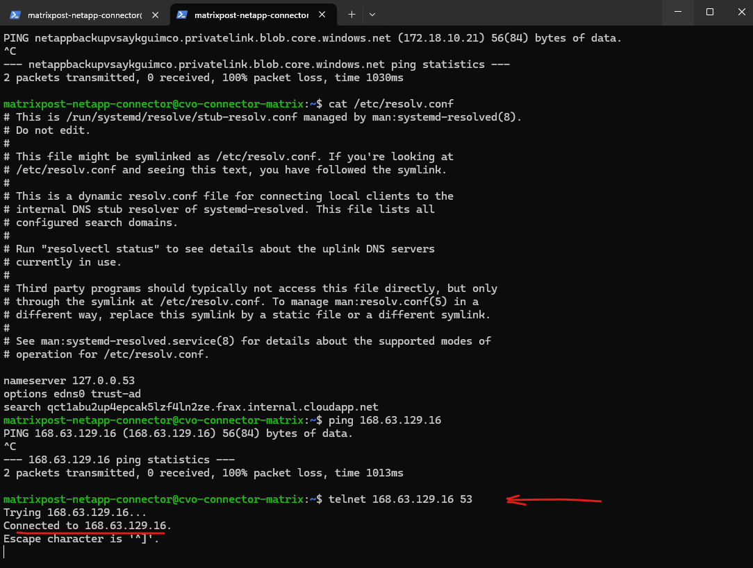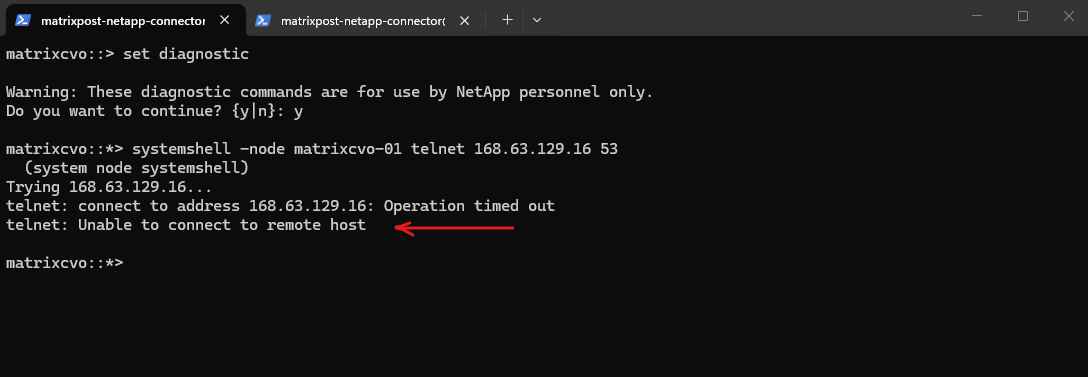 matrixcvo::> set diagnostic matrixcvo::*> systemshell -node matrixcvo-01 telnet 168.63.129.16 53