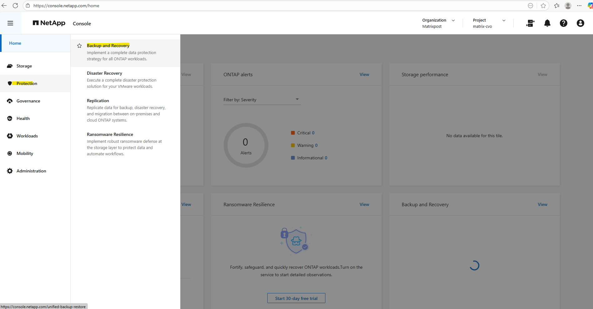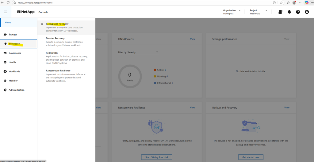 In the NetApp console navigate to Protection -> Backup and Recovery.