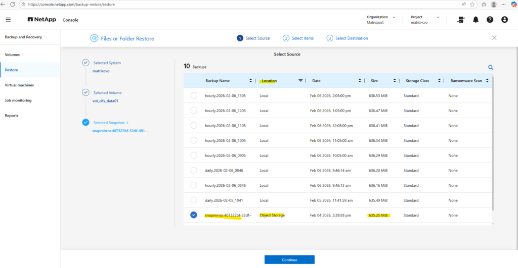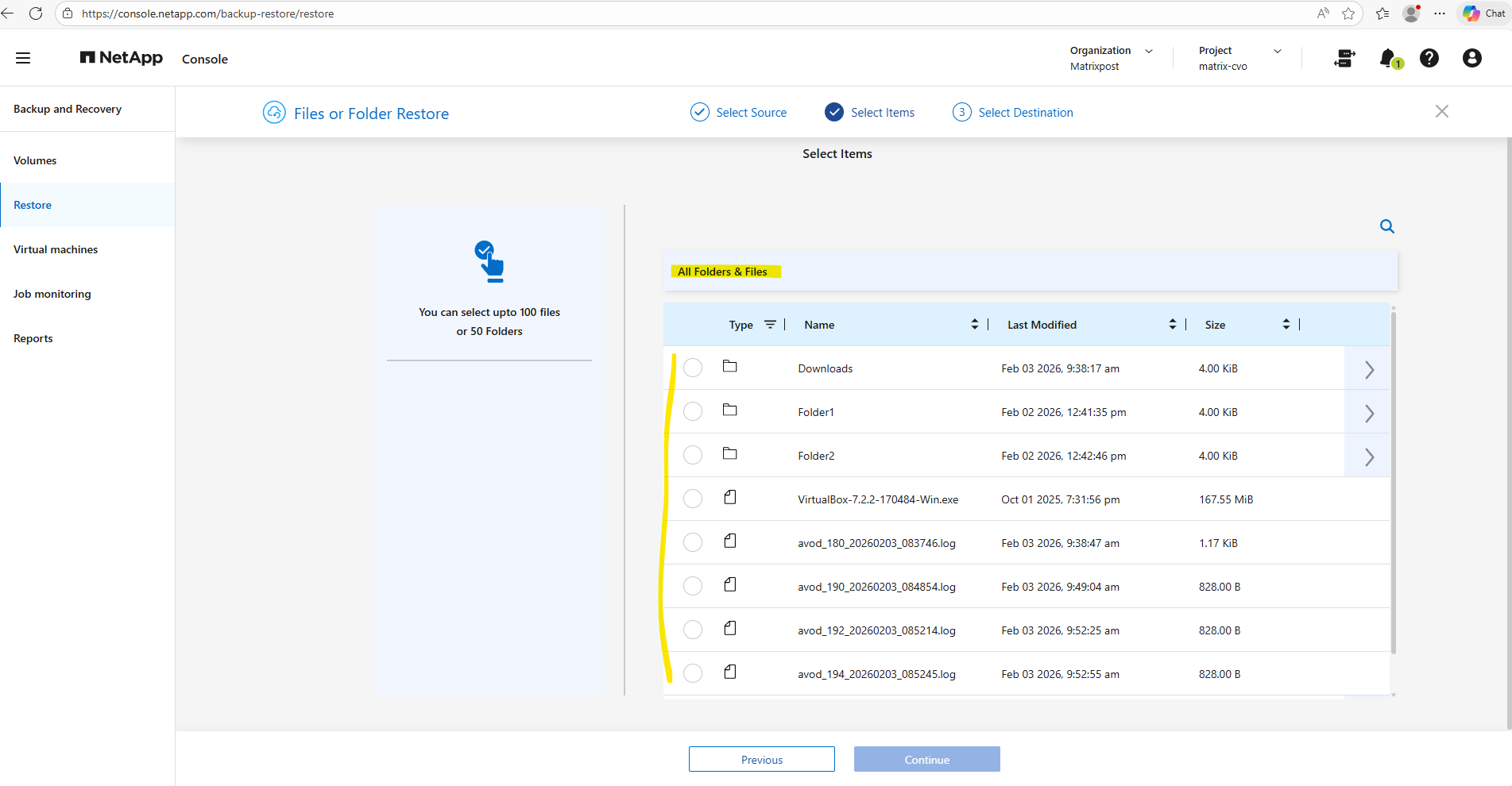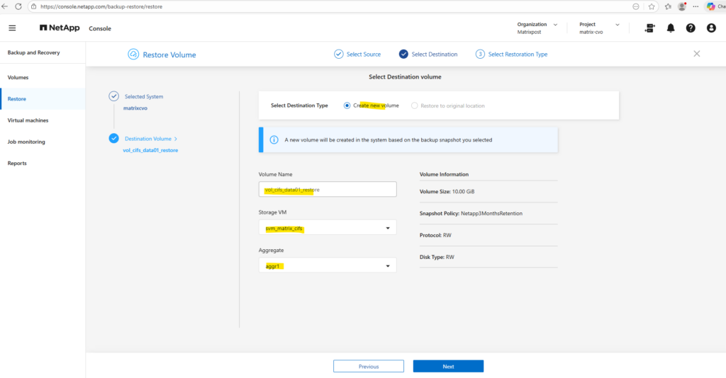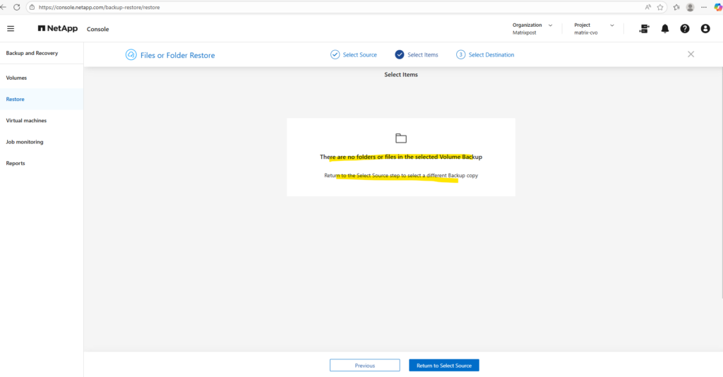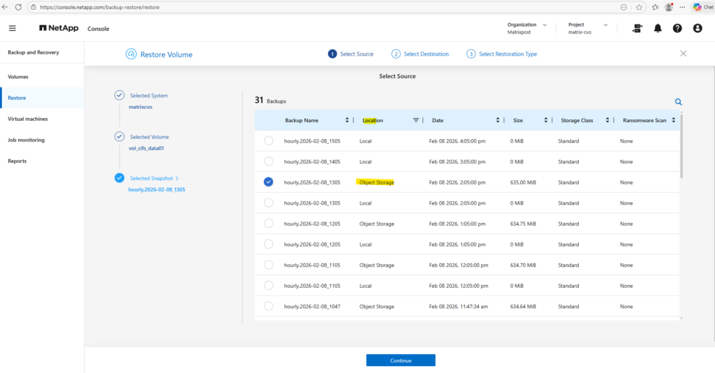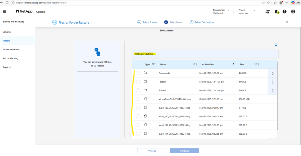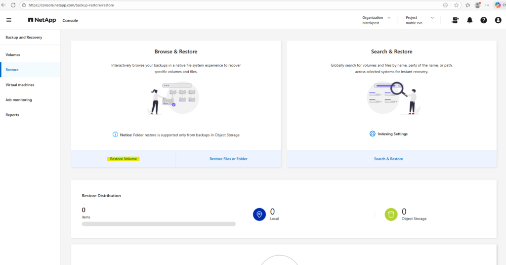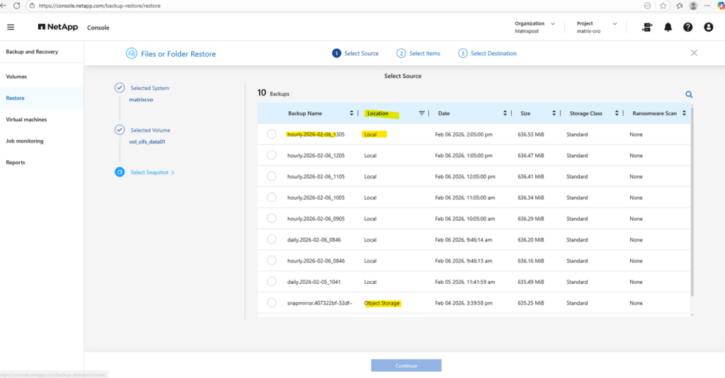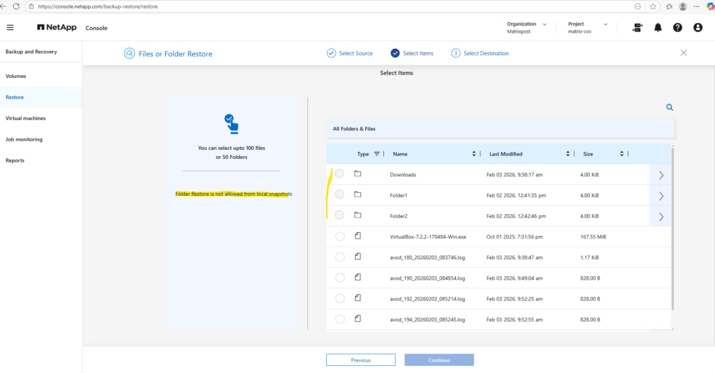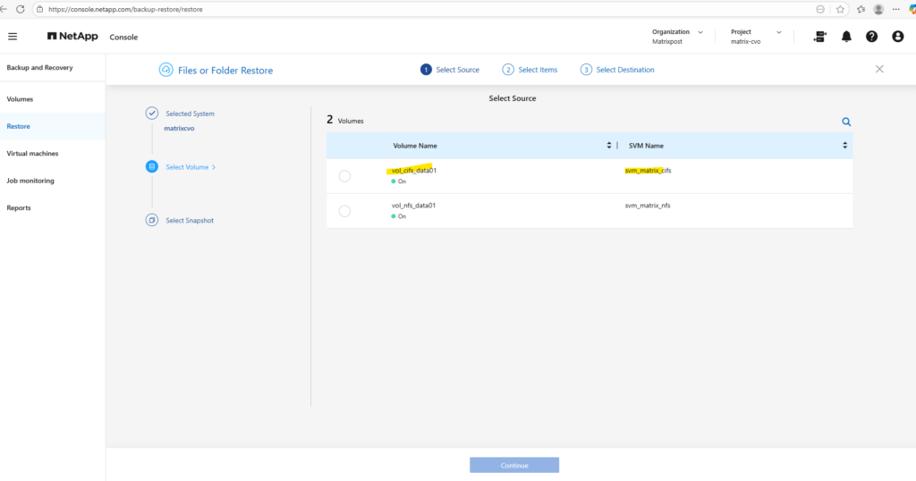 We can here either restore files or folders or a complete volume, how to restore files and folder by using the NetApp console and backups, I was already showing further above by restoring from backup, therefore I will show how to restore a volume below.