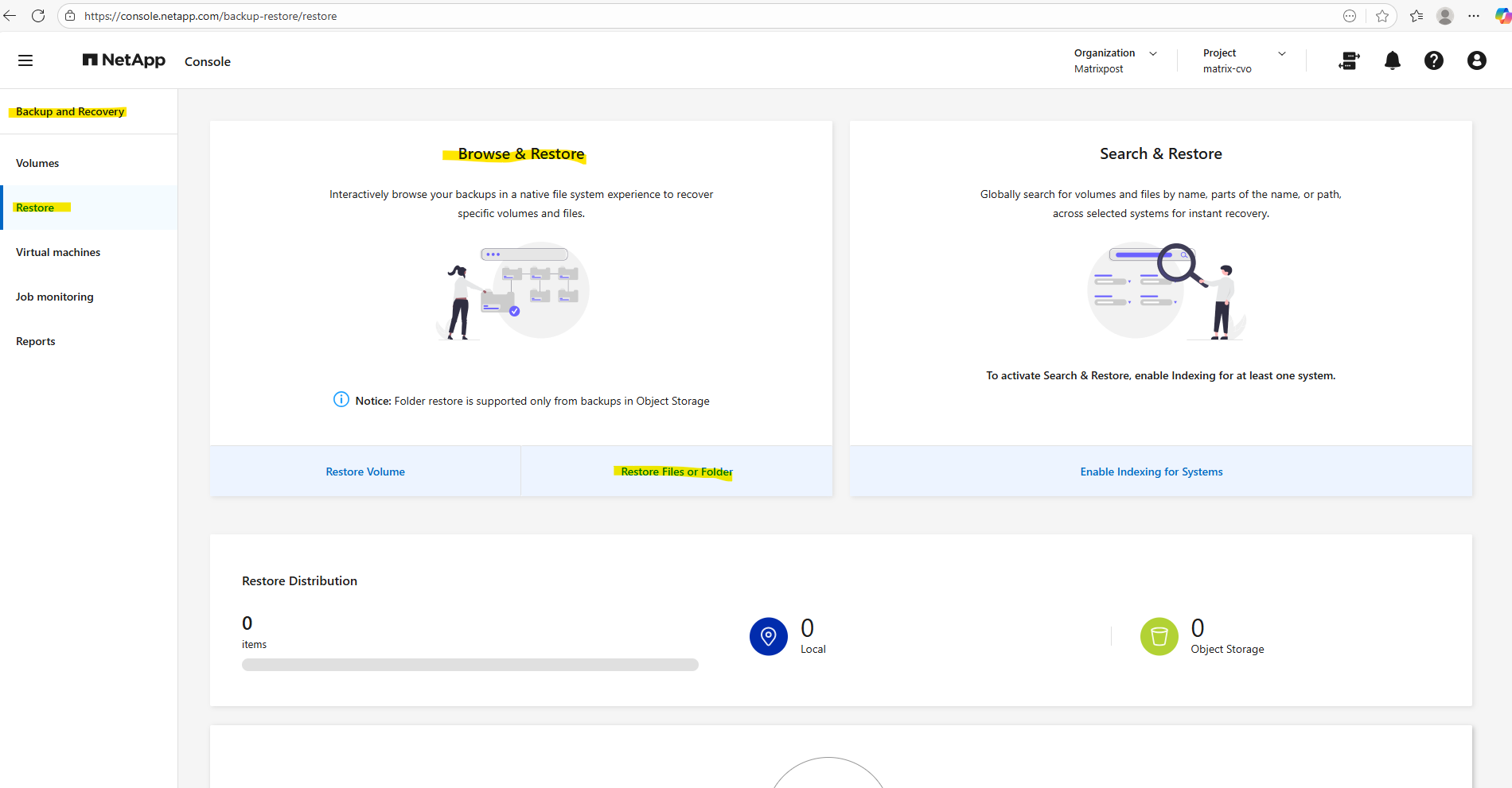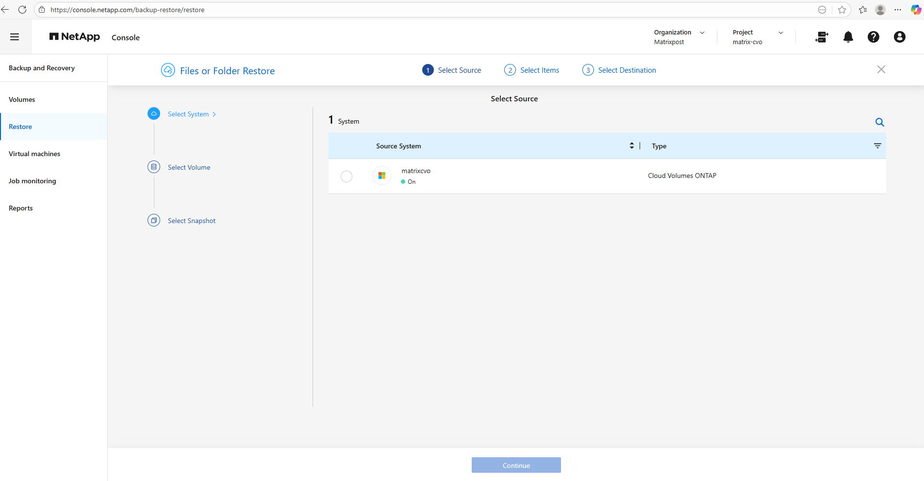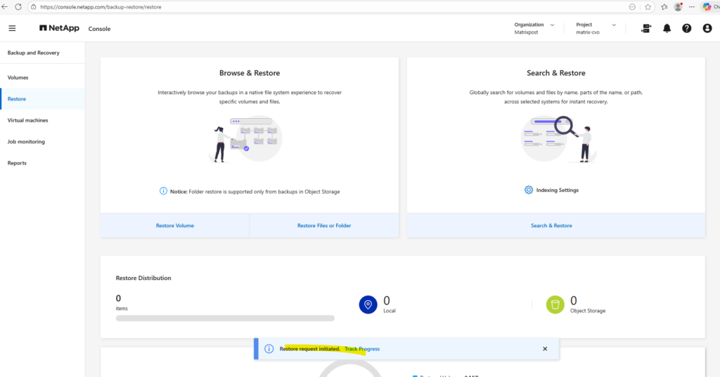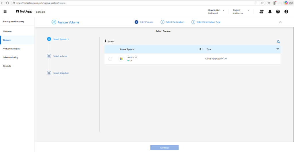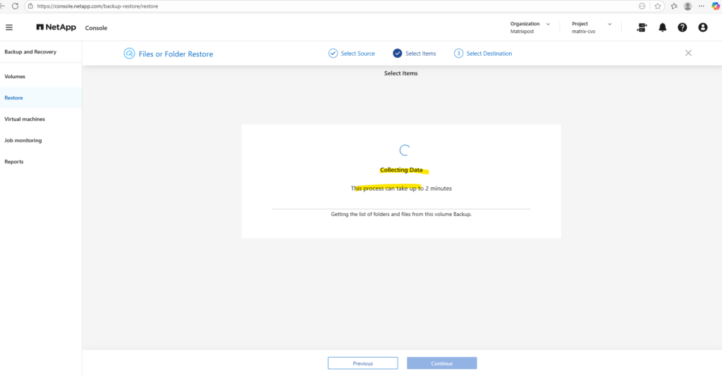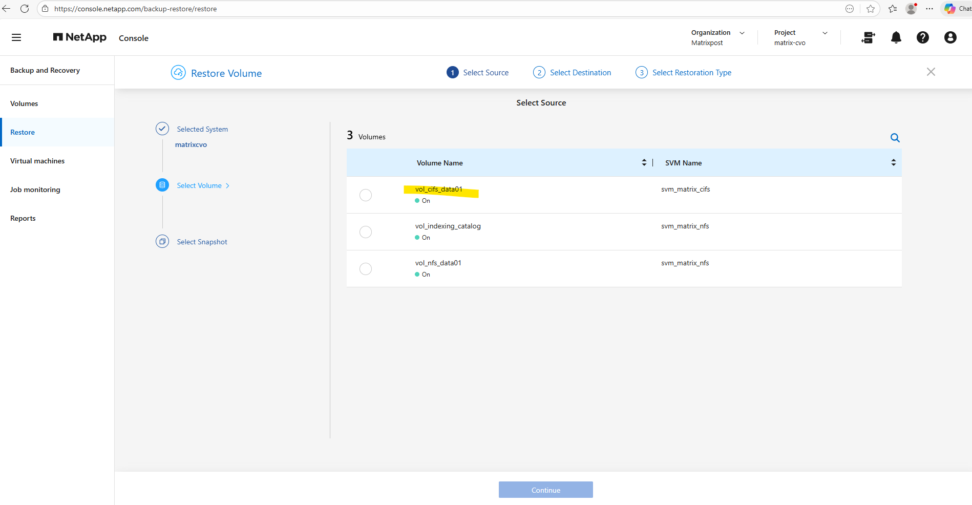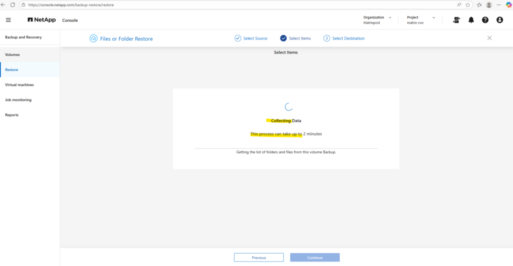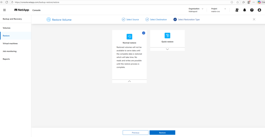 We can here either restore files or folders or a complete volume, how to restore files and folder by using the NetApp console and backups, I was already showing further above by restoring from backup, therefore I will show how to restore a volume below.