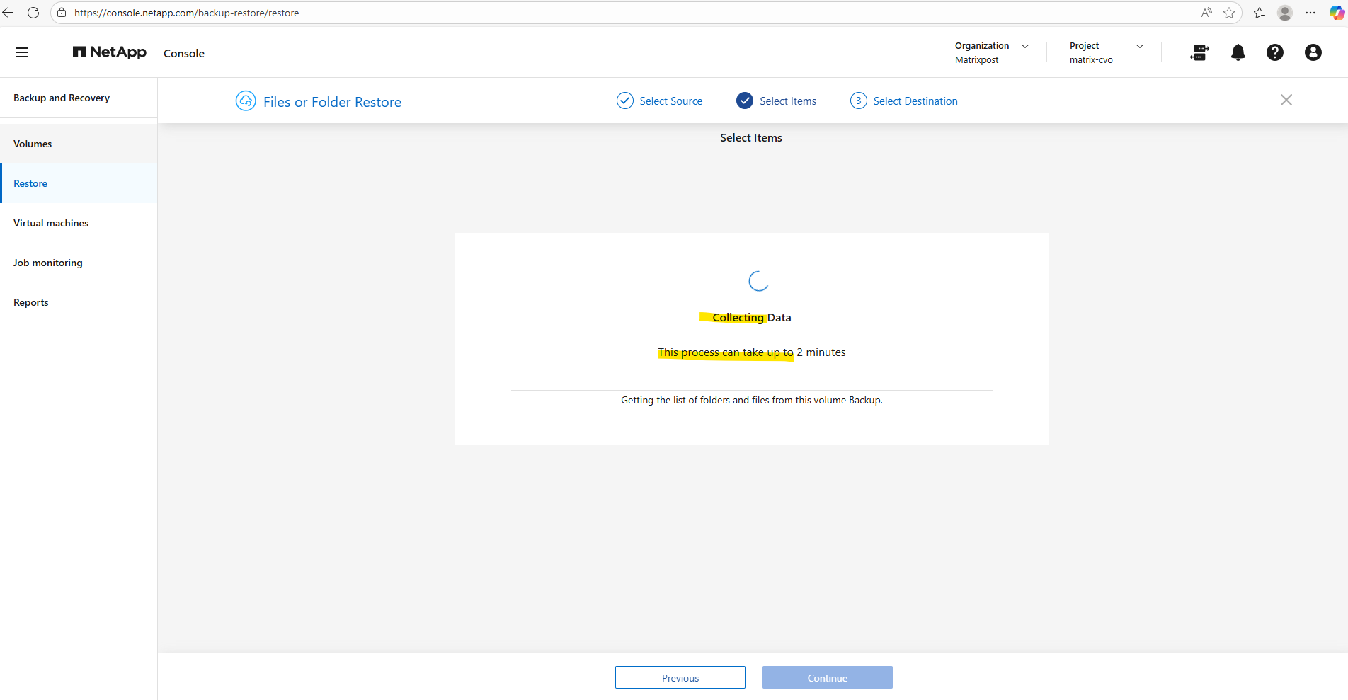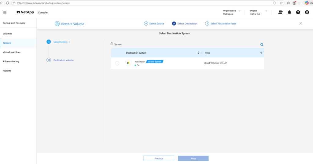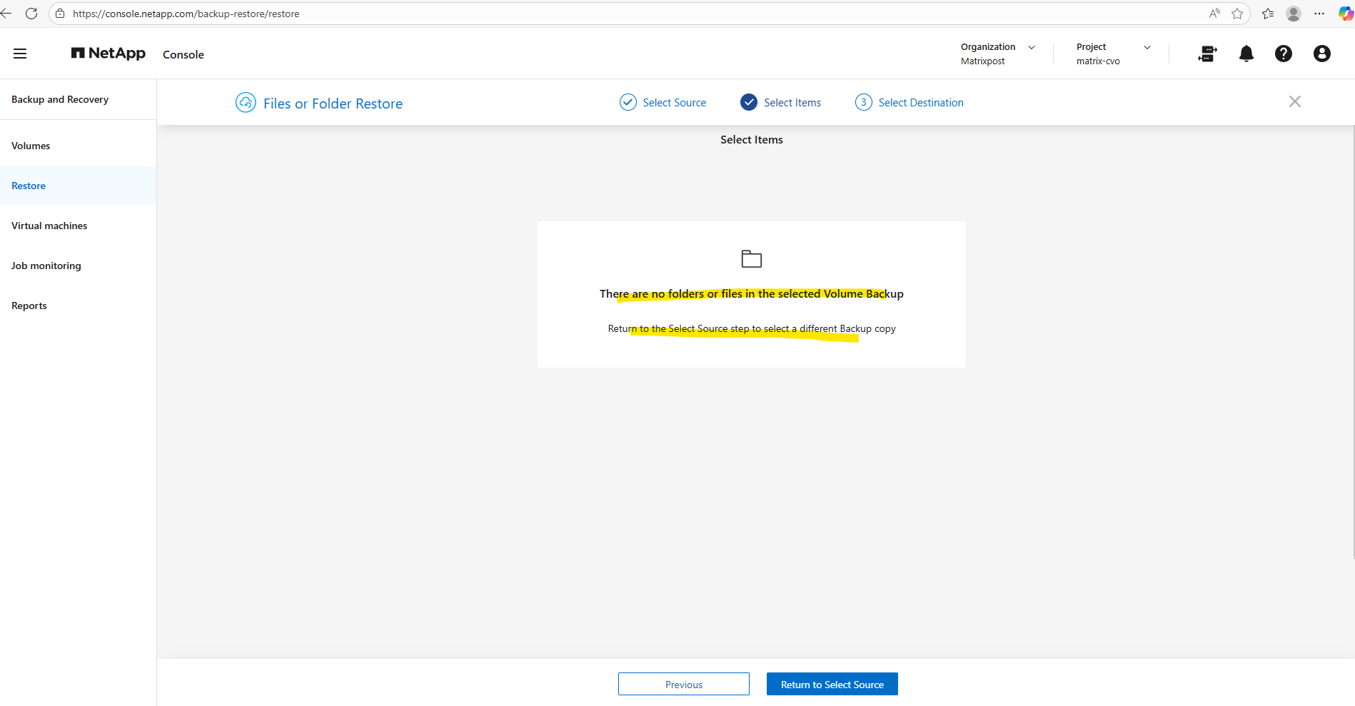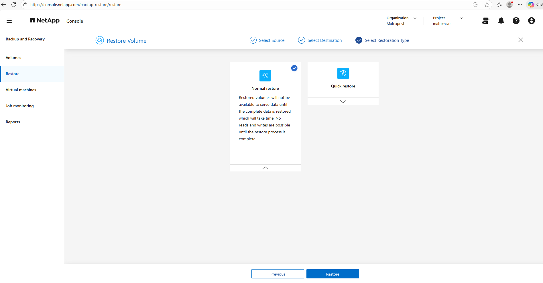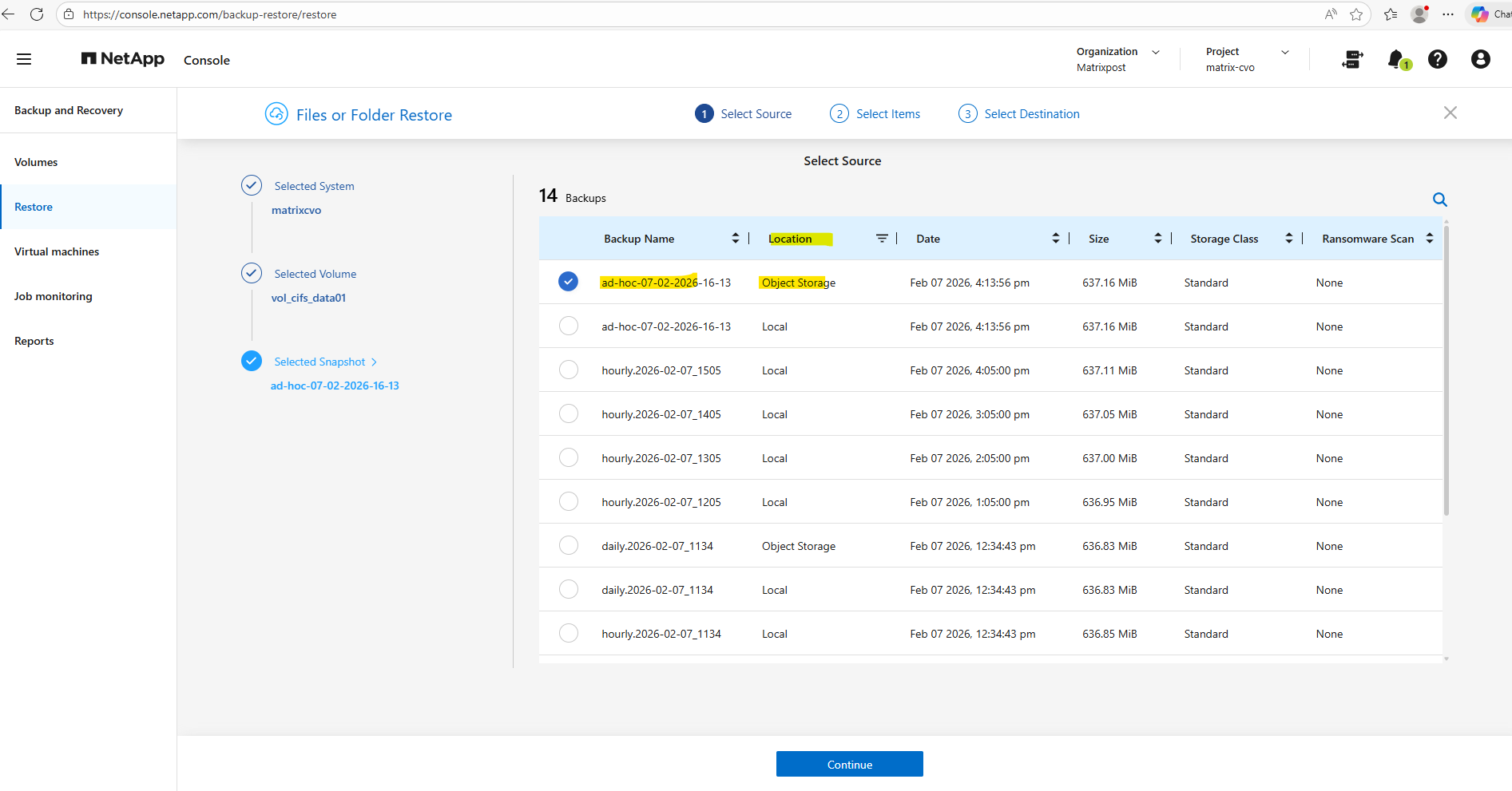We can here either restore files or folders or a complete volume, how to restore files and folder by using the NetApp console and backups, I was already showing further above by restoring from backup, therefore I will show how to restore a volume below.