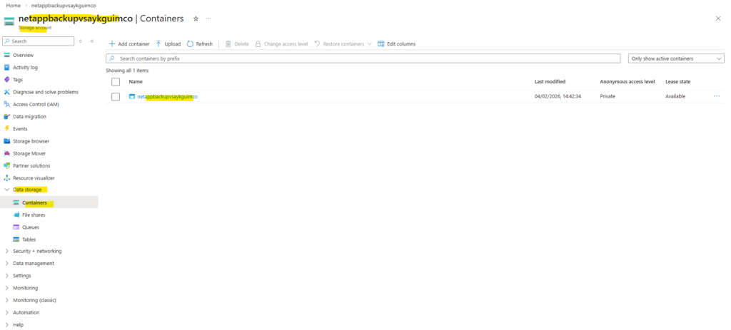 Later when Backup and Recovery is activated successfully and the first backups runs, navigate to Data storage → Containers, the presence of a container confirms that the backups are stored in Azure Blob Storage. Containers are the top-level namespace for blobs, which aligns with the object storage model that Cloud Volumes ONTAP uses for backup data.
