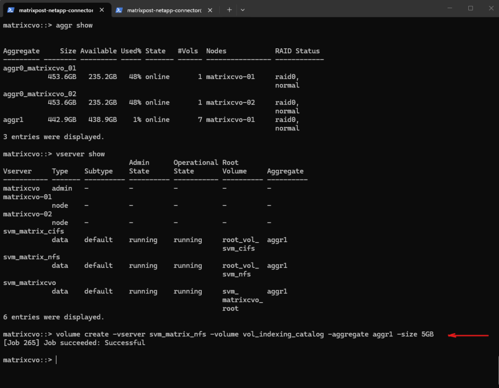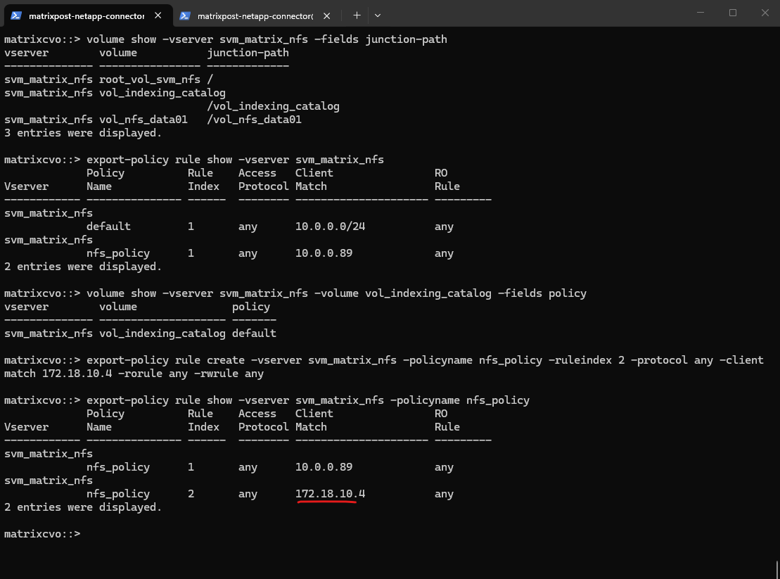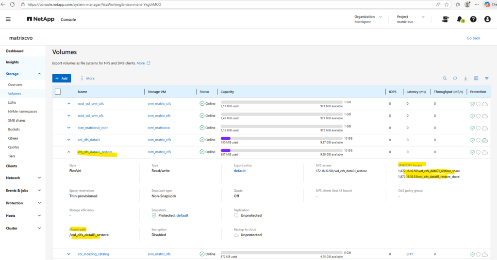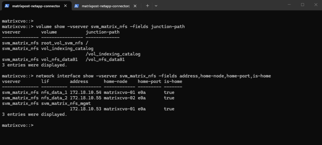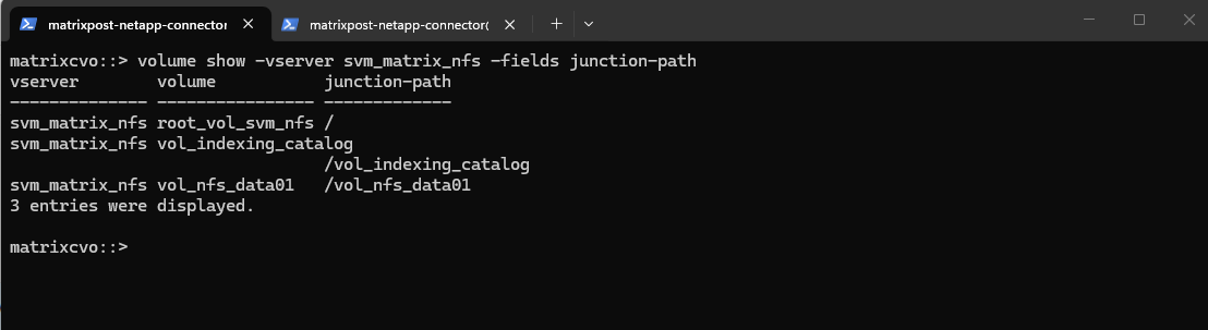 matrixcvo::> volume show -vserver svm_matrix_cifs -fields volume,junction-path,state