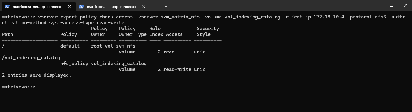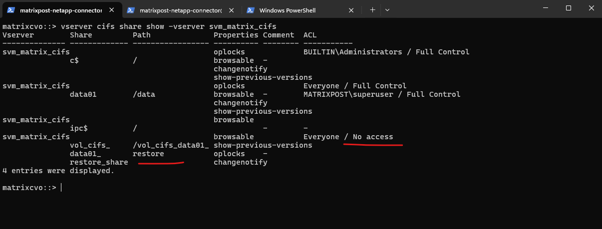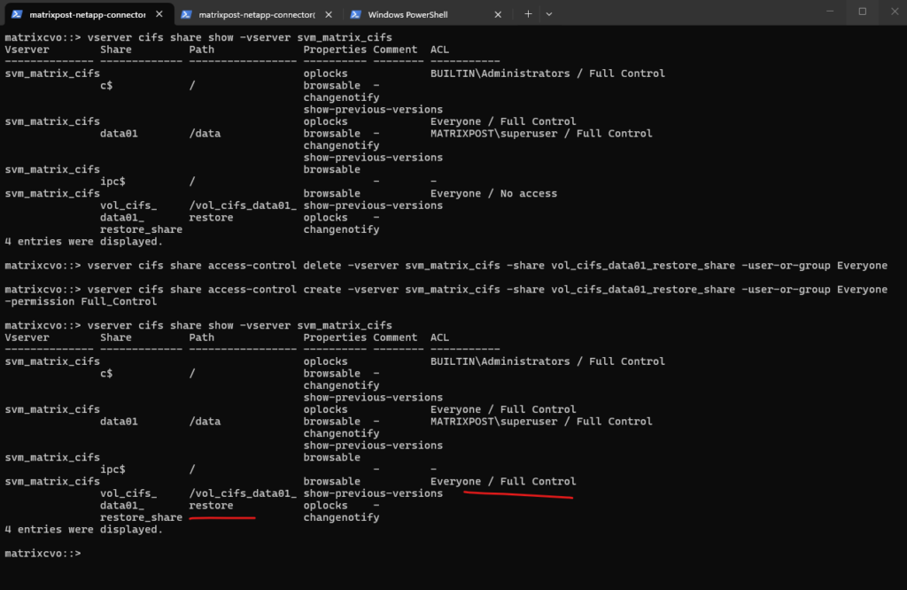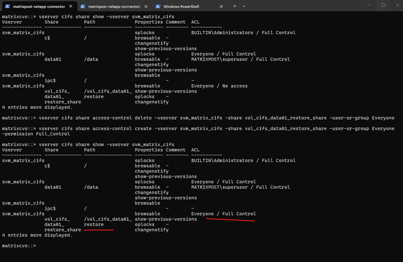 # first remove the existing share access control matrixcvo::> vserver cifs share access-control create -vserver svm_matrix_cifs -share vol_cifs_data01_restore_share -user-or-group "Everyone" -permission Full_Control # grant full control matrixcvo::> vserver cifs share access-control create -vserver svm_matrix_cifs -share vol_cifs_data01_restore_share -user-or-group Everyone -permission Full_Control # verify matrixcvo::> vserver cifs share show -vserver svm_matrix_cifs