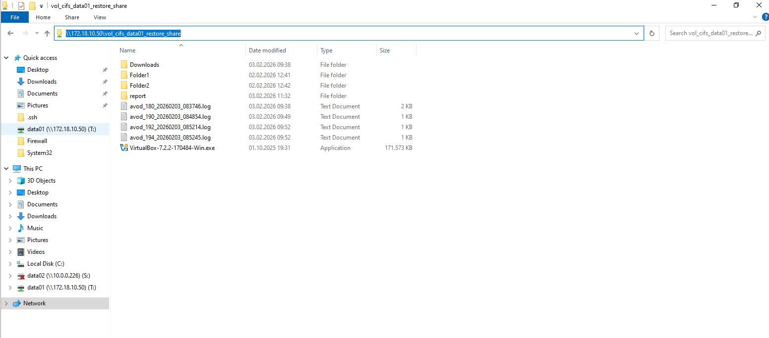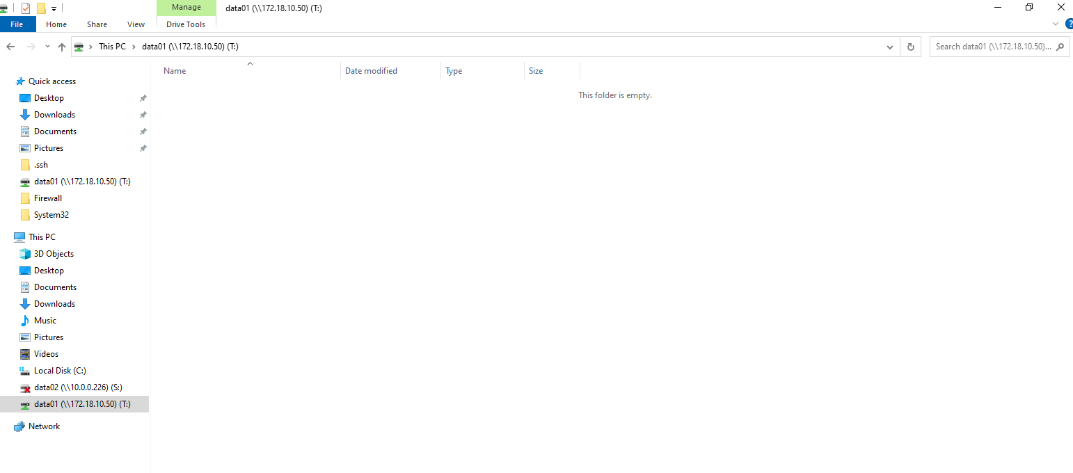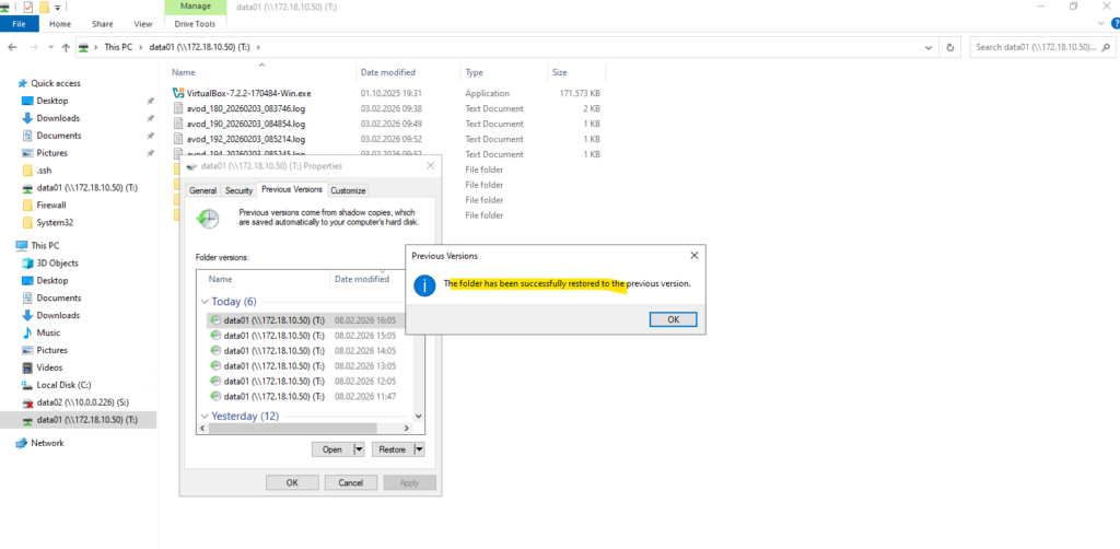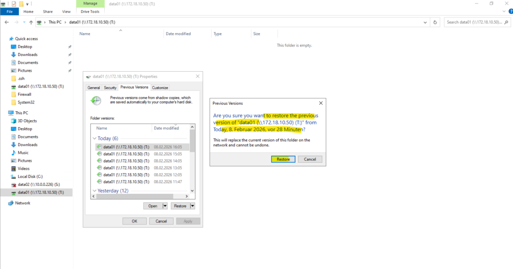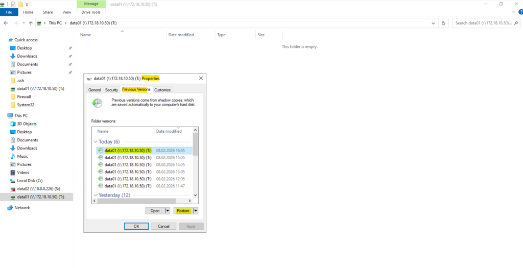 To demonstrate restoring from a snapshot, I will first delete all files on the data01 cifs share which is mounted below on a Windows client.