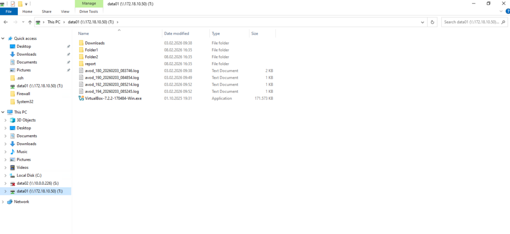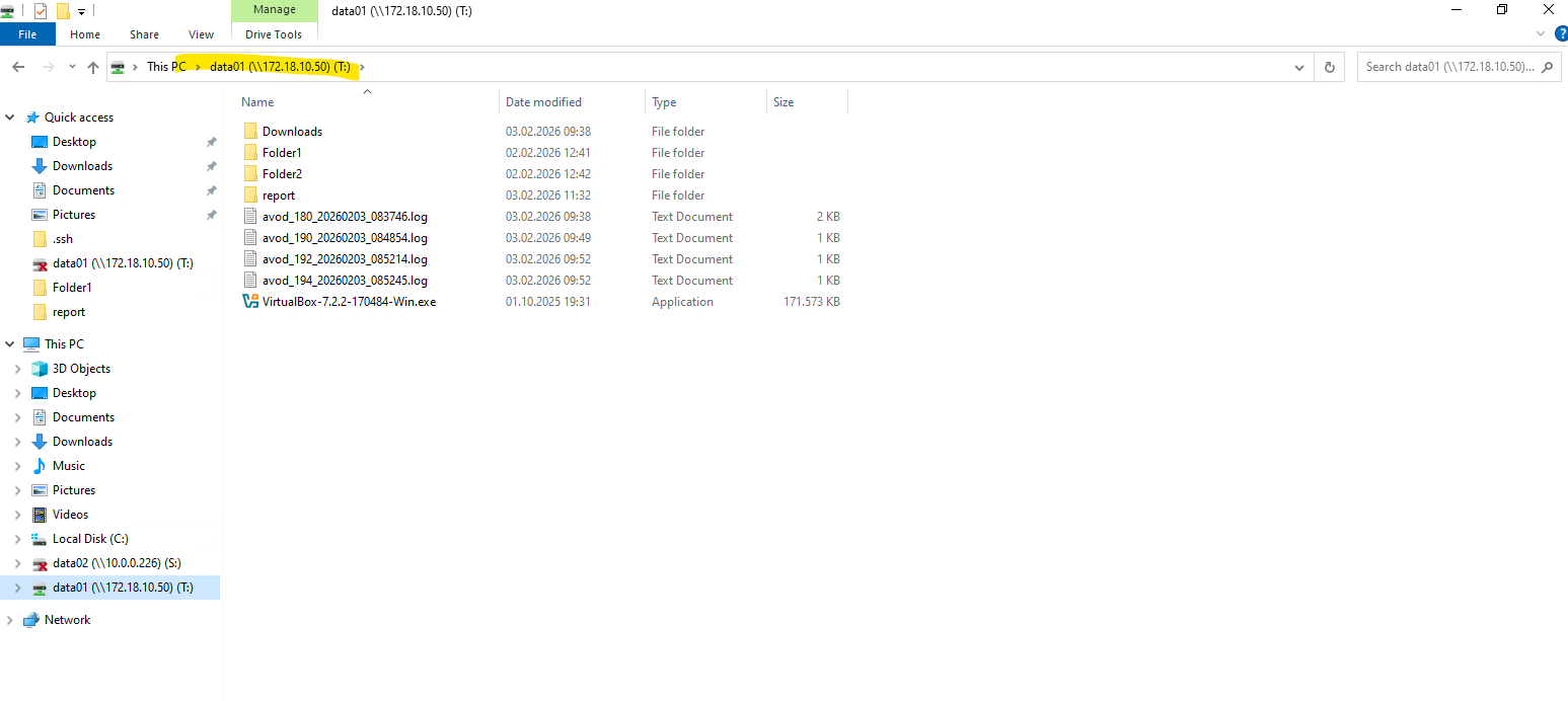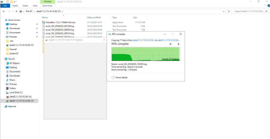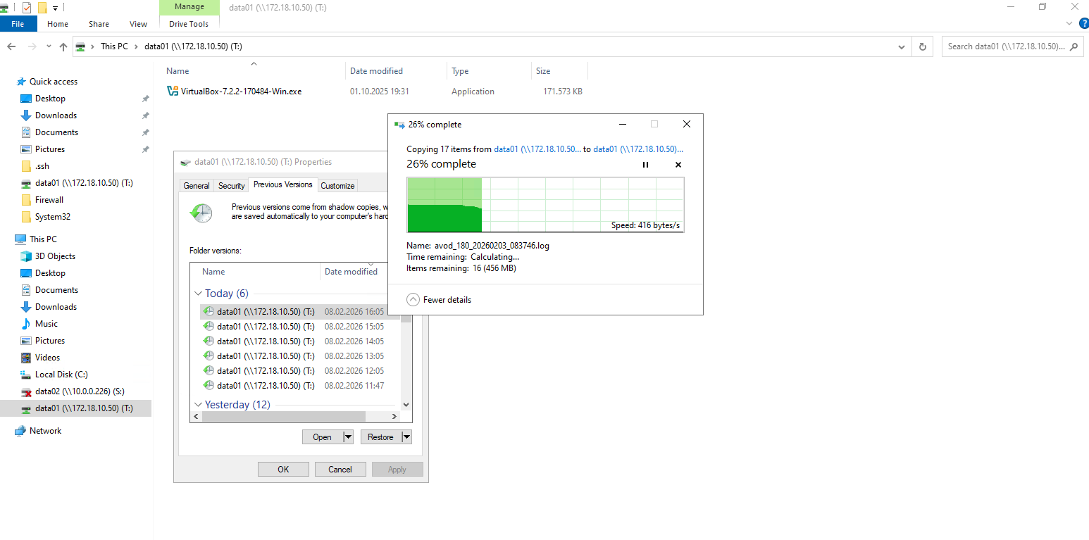 To demonstrate restoring from a snapshot, I will first delete all files on the data01 cifs share which is mounted below on a Windows client.