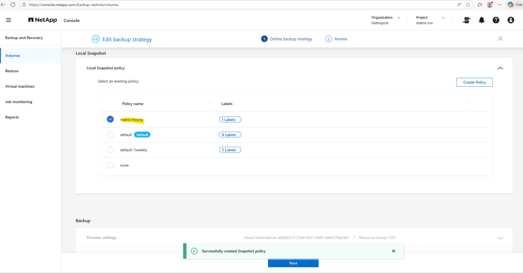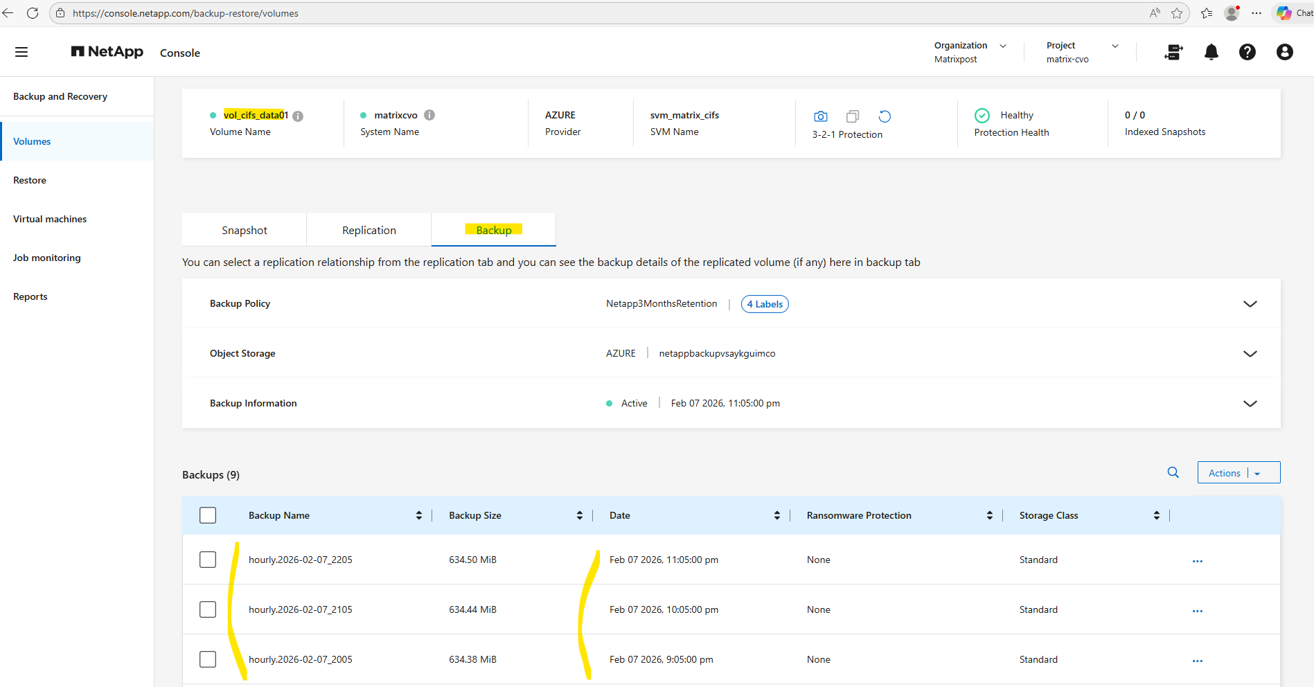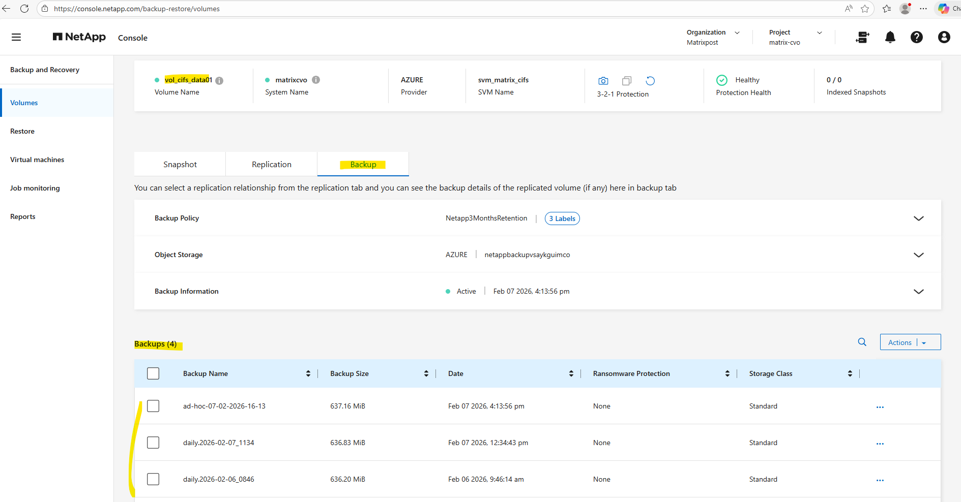 In this step, I linked my Cloud Volumes ONTAP instance to an Azure Blob storage account, which serves as the secure, off-site repository for all volume backups.