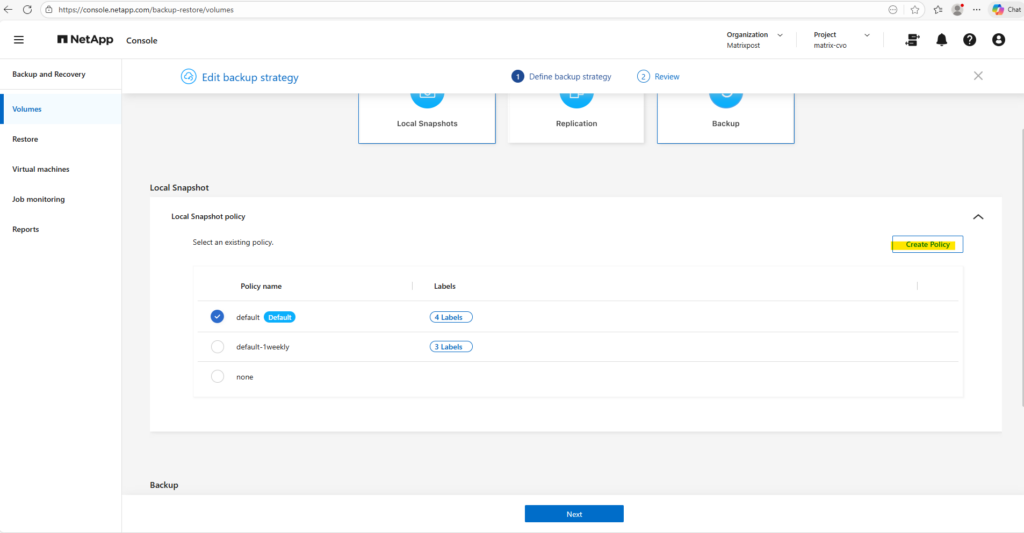 Now we need to choose which protection methods to enable, local Snapshots, replication, and backup, and either assign existing policies or create new ones aligned with our retention requirements.