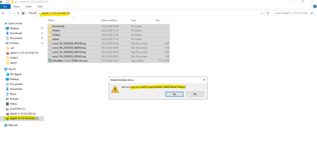 I will delete all files and folder again to demonstrate restoring them by using the NetApp console and either also local snapshots or backups.