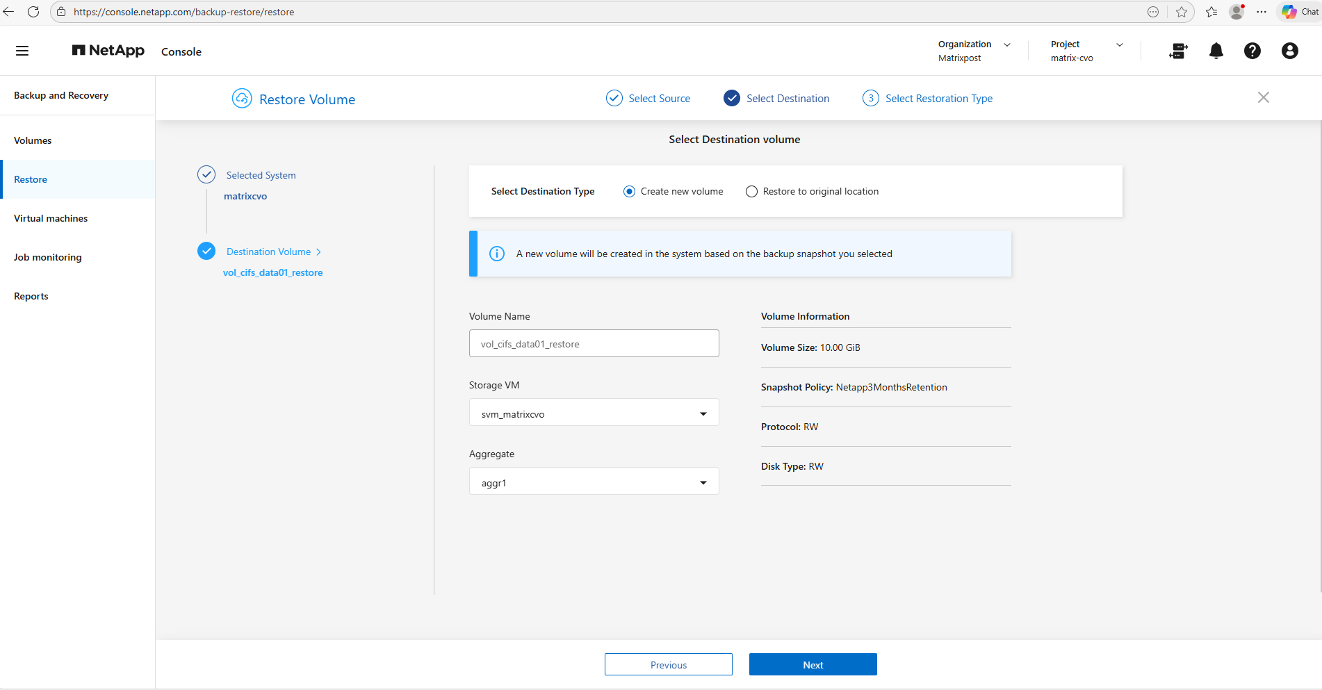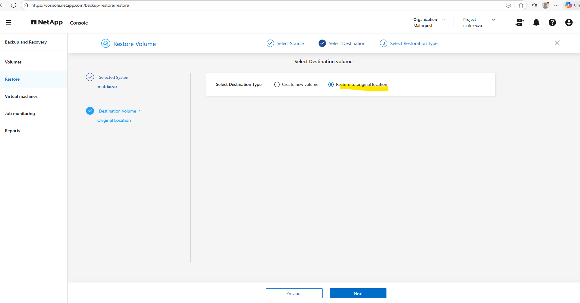 When selecting the destination for a restore, administrators can either create a new volume or choose Restore to original location to place the data back into its source volume.