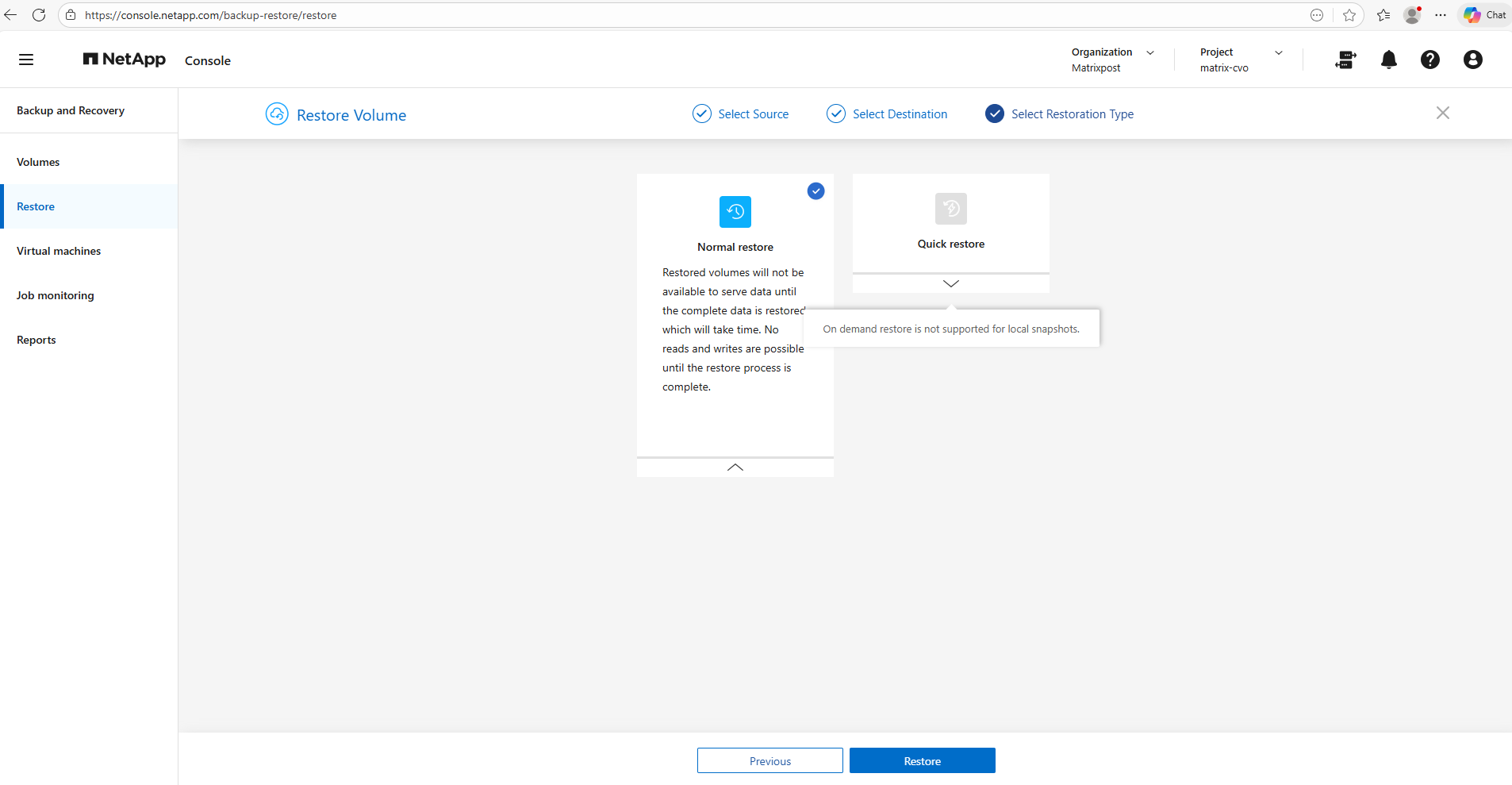 The NetApp Console also allows restores to an alternate Cloud Volumes ONTAP (CVO) system, providing additional flexibility during recovery operations.