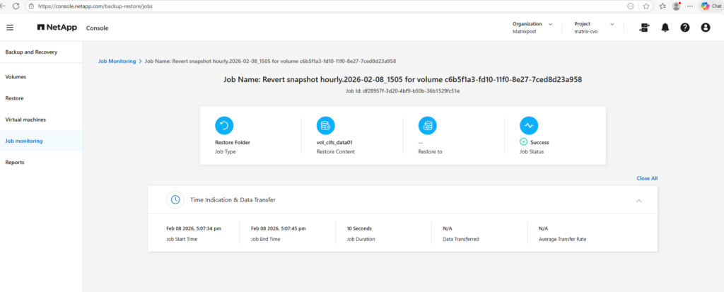 In this lab environment, restoring approximately 600 MB completed in about 10 seconds, highlighting the near-instant recovery capability that makes snapshots such an efficient data protection mechanism.