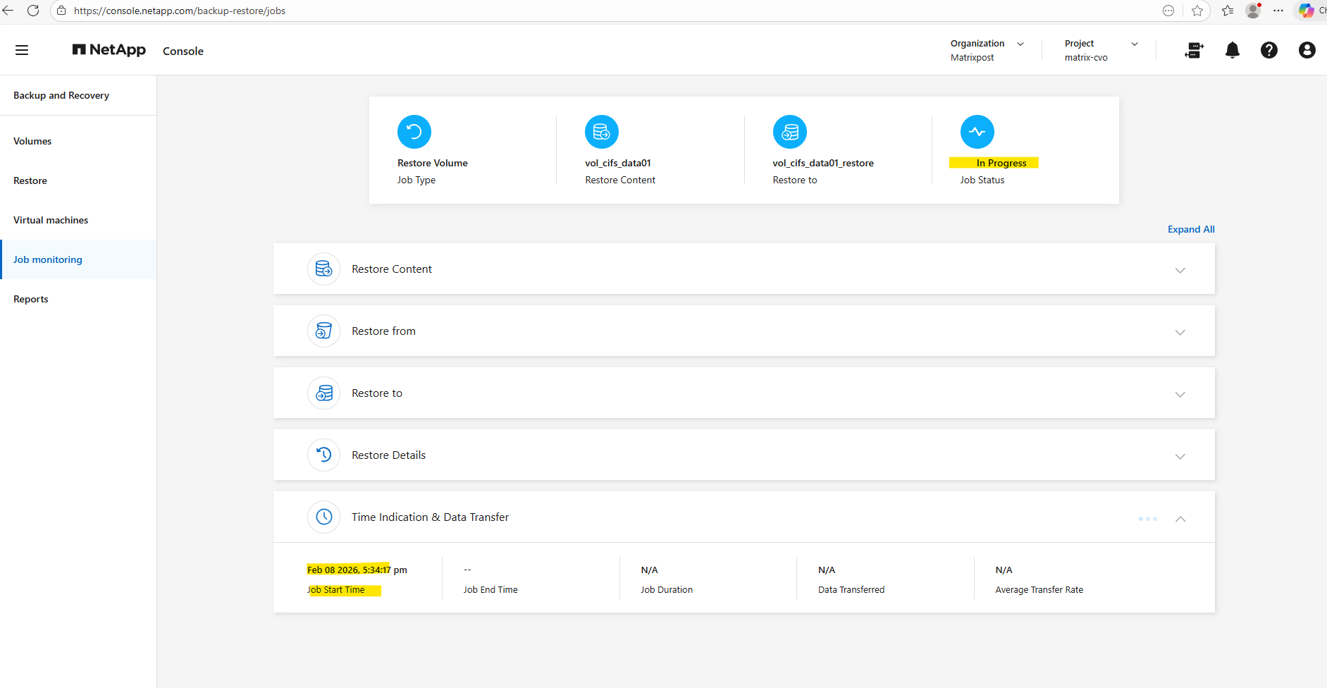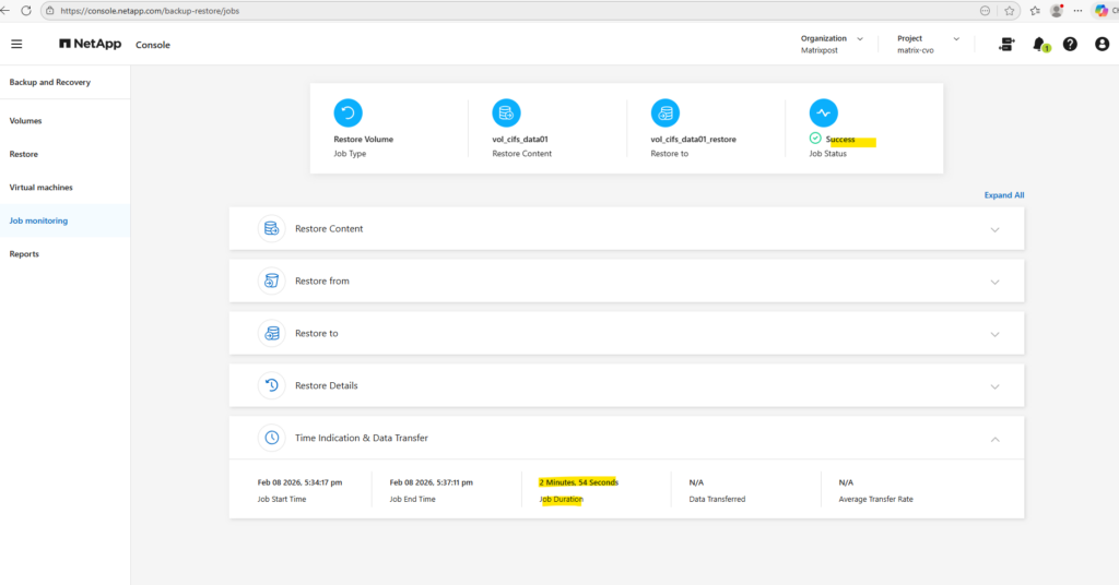 The restored volume will not be available to serve data until the recovery process has fully completed. During this time, no read or write operations are permitted, as ONTAP must first reconstruct the entire dataset to ensure consistency. Depending on the volume size, this process can take some time and should be considered when planning recovery operations.
