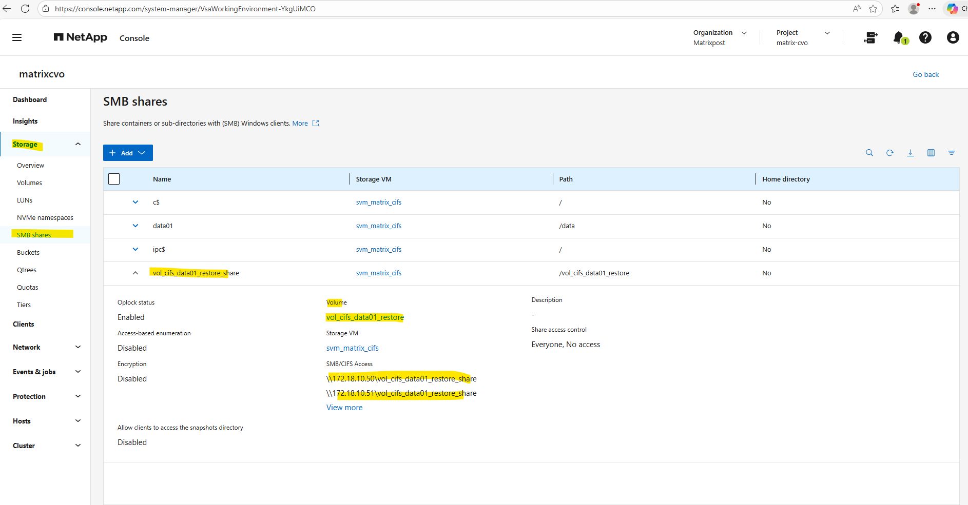 After the restore, the automatically created SMB share was configured with Everyone / No access, which is a security-first default in ONTAP.