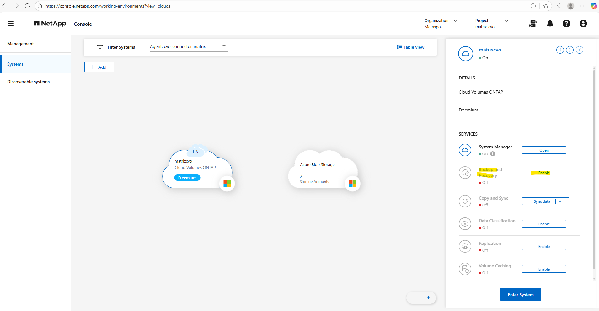 In the NetApp console navigate to Storage -> Management, select the CVO system you want to enable Backup and Recovery and on the shown up right bar click on Enable for Backup and Recovery as shown below.