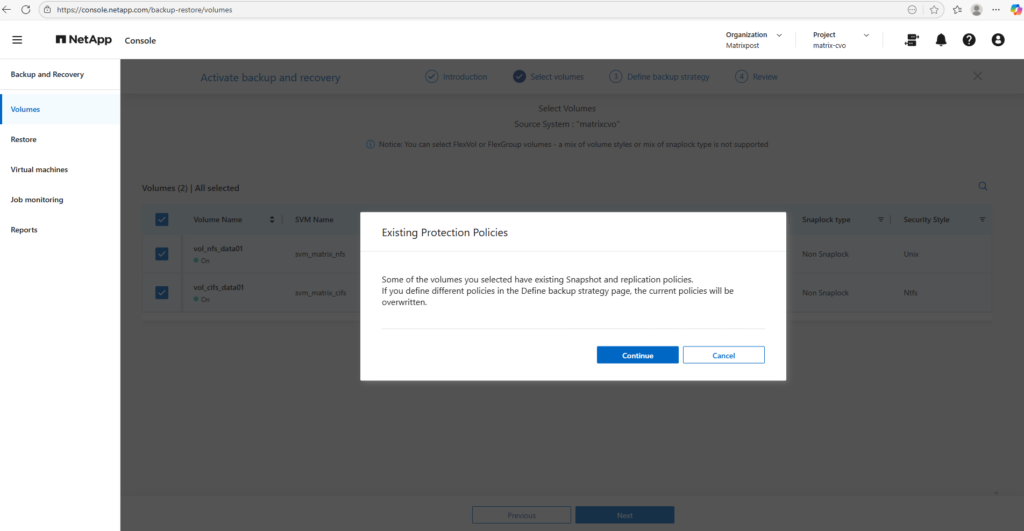 This warning indicates that any policies defined in the Define Backup Strategy step will replace the existing configurations, ensuring that the selected volumes follow a consistent protection model.