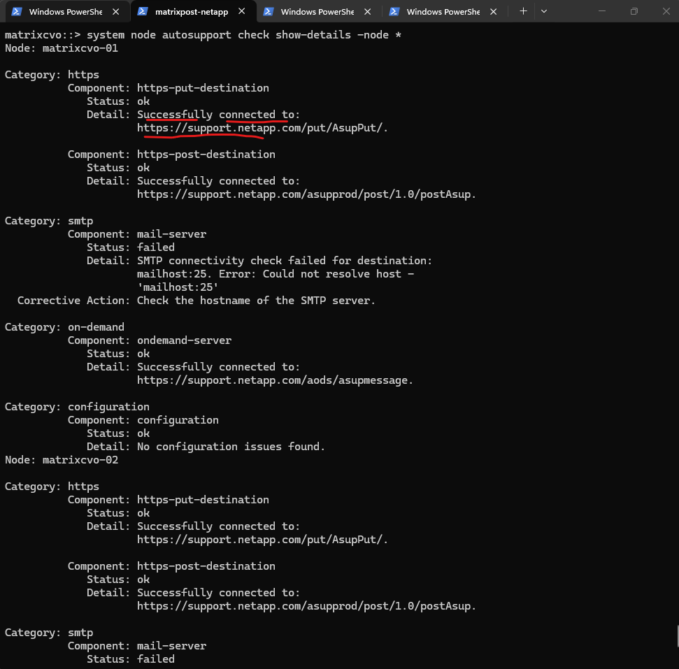 This diagnostic output confirms that my lab cluster has fully functional HTTPS connectivity to NetApp’s support servers, successfully passing both the “PUT” and “POST” transmission tests.
