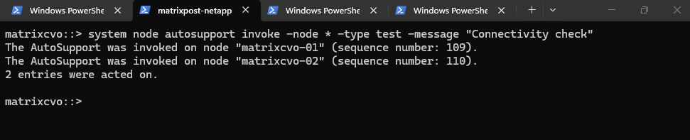 matrixcvo::> system node autosupport invoke -node * -type test -message "Connectivity check"