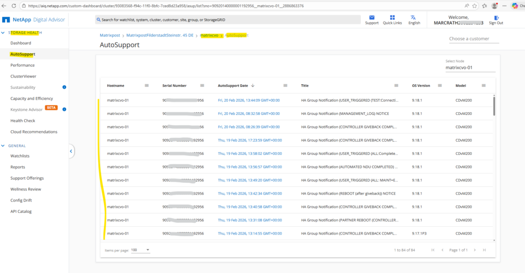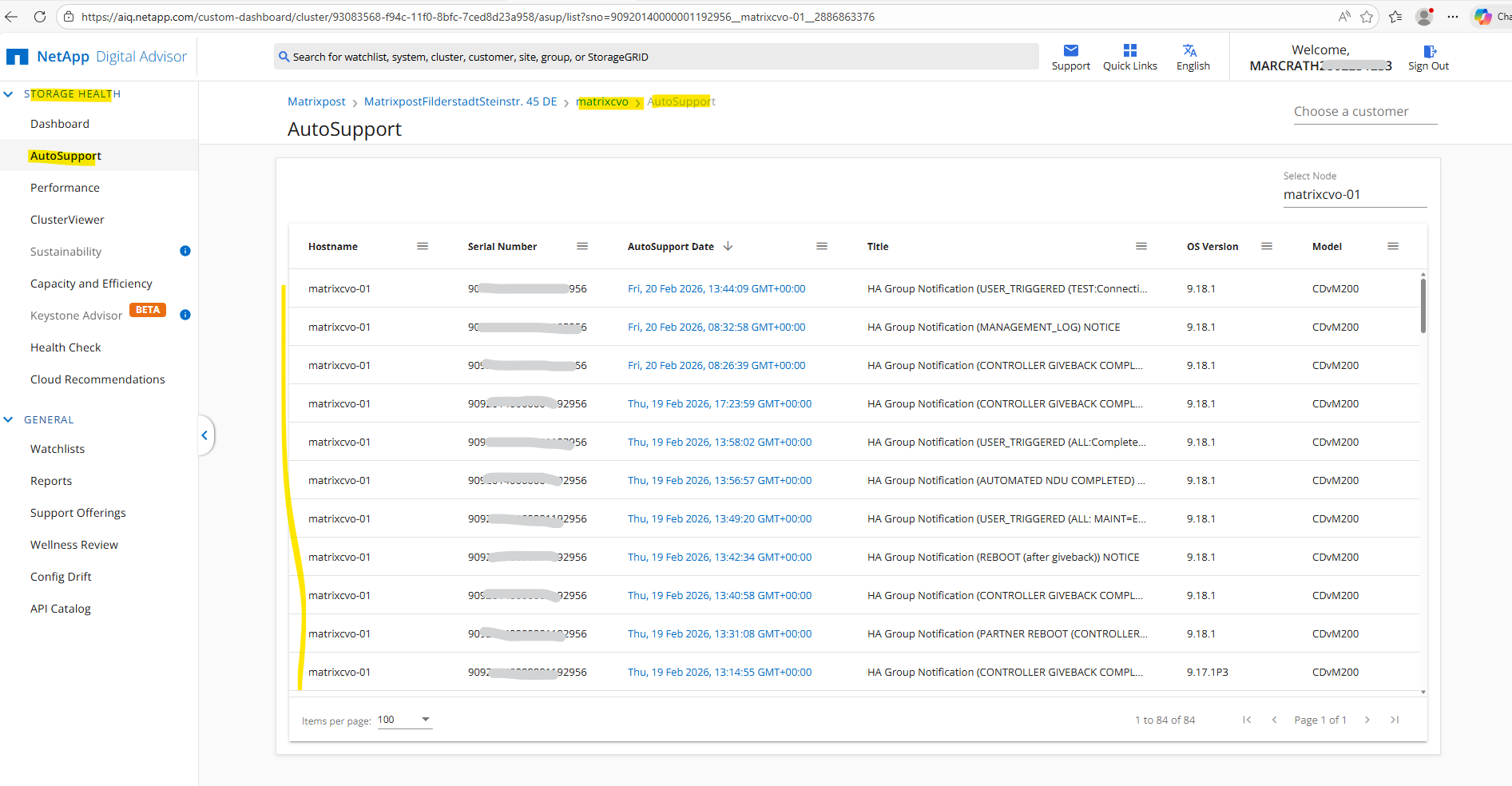 The AutoSupport page within the Storage Health menu serves as a web-based mirror of our cluster’s local history, providing a searchable archive of all telemetry messages received by NetApp.