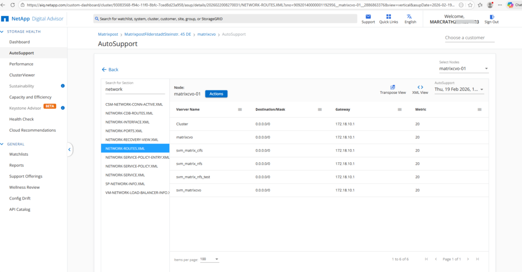NETWORK-ROUTES.XML: This is crucial for troubleshooting AutoSupport itself; it shows the ONTAP routing table, allowing you to verify if the cluster has the correct “next hop” to reach your Azure-based proxy or the internet gateway.